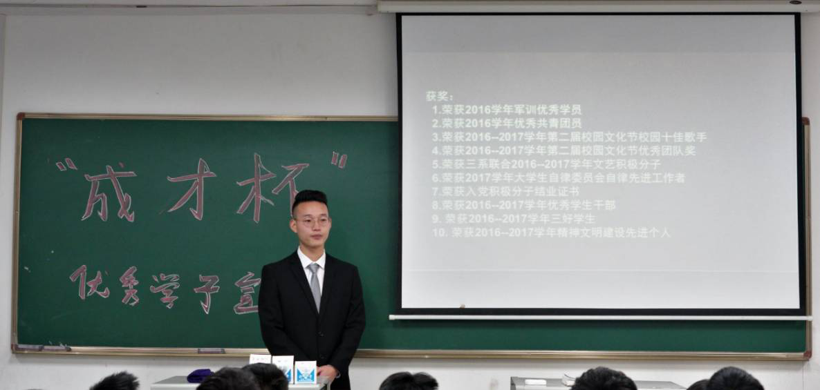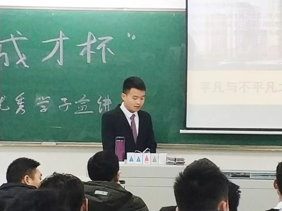 汤成进,来自汽车运用与维修技术1603班,其宣讲主题为“千里之行,始于足下”在宣讲过程中,他告诉大家:“多去参加社会实践活动,从中树立信念,培养团队意识。生命不止,奋斗不息。”