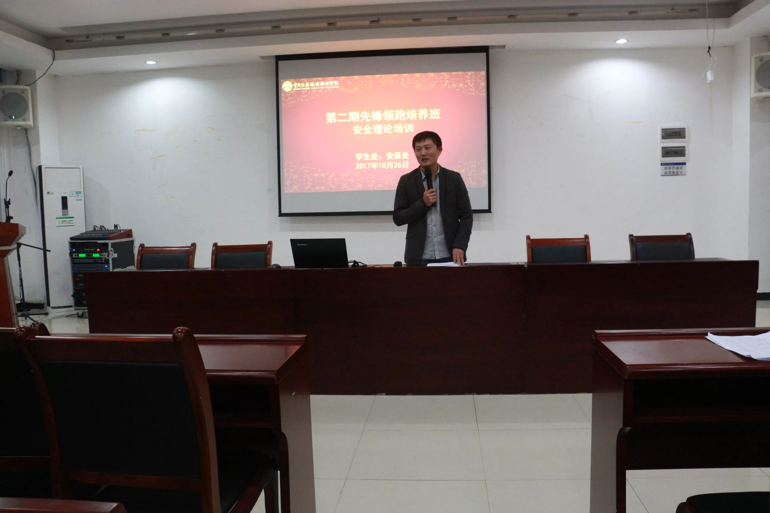 先锋领跑培训班安全理论培训 我院先锋领跑培训班先后开展了开班仪式、理论培训,在素质拓展阶段即将运行之际,学生工作部于2017年10月26日