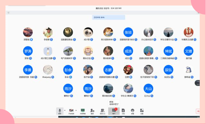 为及时了解各组织工作开展进度、深入探讨工作方法,保障各院系学生组织工作的有序进行并解决工作中突出的问题,安排指导各院系学生会组织的下周系列工作。我院团委于2020年3月23日19:30召开本学期第六周线上例会。本次会议由团委副书记彭余老师主持召开,学生处处长刘妮娅、招生就业处副处长田勇、学生处全体老师、团委各直属部门学生代表以及各院系学生组织代表参加会议。