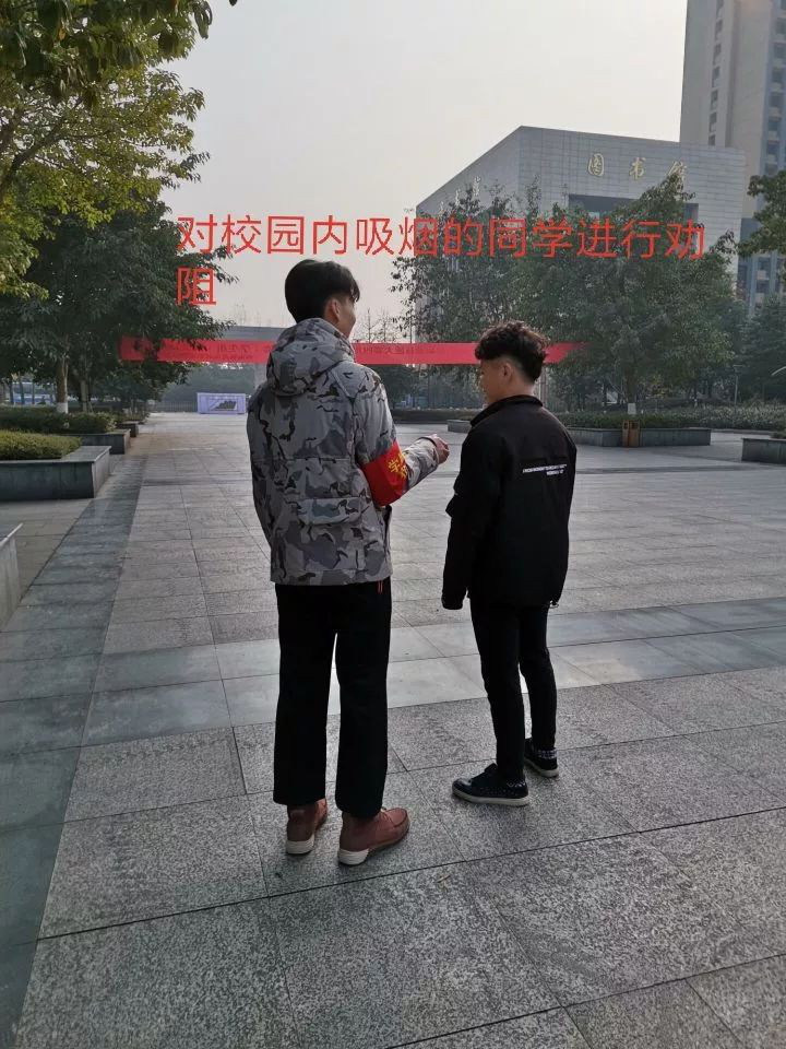 本次无烟校园活动已经进行了一段时间,在每天早上8:00~8:30、中午12:40~13:30及晚上20:40~21:30大学生自律委员会护校队对学院所有地区进行检查,劝诫并登记。保证校园内无人吸烟,校园内无烟蒂、无吸烟者。同时在各大校园重点区域设立禁烟标识,全面把控,绝不姑息。