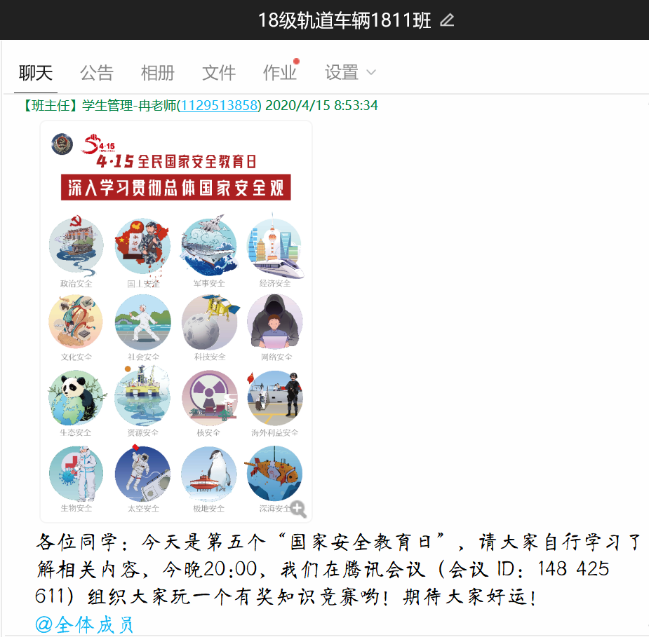 轨道车辆与机械系动车组检修技术1801、1802、设计1801、制造1801班全体同学在辅导员吴成雨老师的组织下通过腾讯APP会议召开主题班会。通过观摩安全教育视频了解国情,结合当下疫情防控以强化责任意识的同时提高法制意识,从而增强国家安全意识。