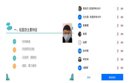 然后余航老师从本专业同学的角度出发并分析,在余老师的问卷调查中了解到全专业有部分同学使用蚂蚁花呗、借呗等网络预支软件,余老师特别强调这类行为是属于个人消费贷款也是网贷的一种,虽然这类网贷不及裸贷、抵押贷等不合法网贷的危害大,但这种行为是一个不好的习惯,它会使自身消费的观念产生变化。