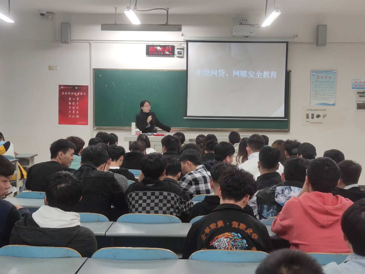10月17日晚动车组检修专业2001、2002班全体同学在辅导员刘仙老师的带领下于主校区B508教室举行“拒绝网贷、网赌安全教育”主题班会。