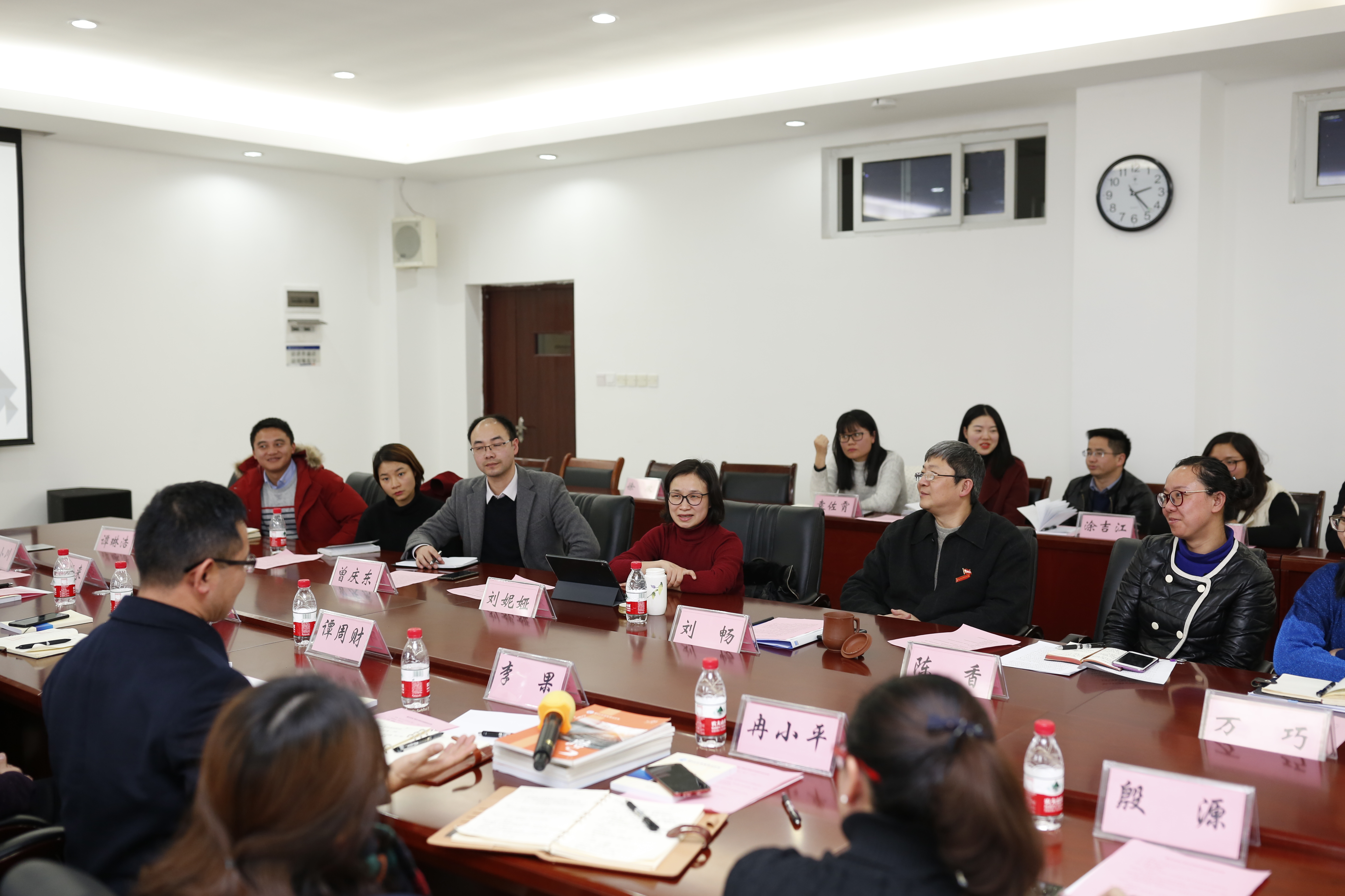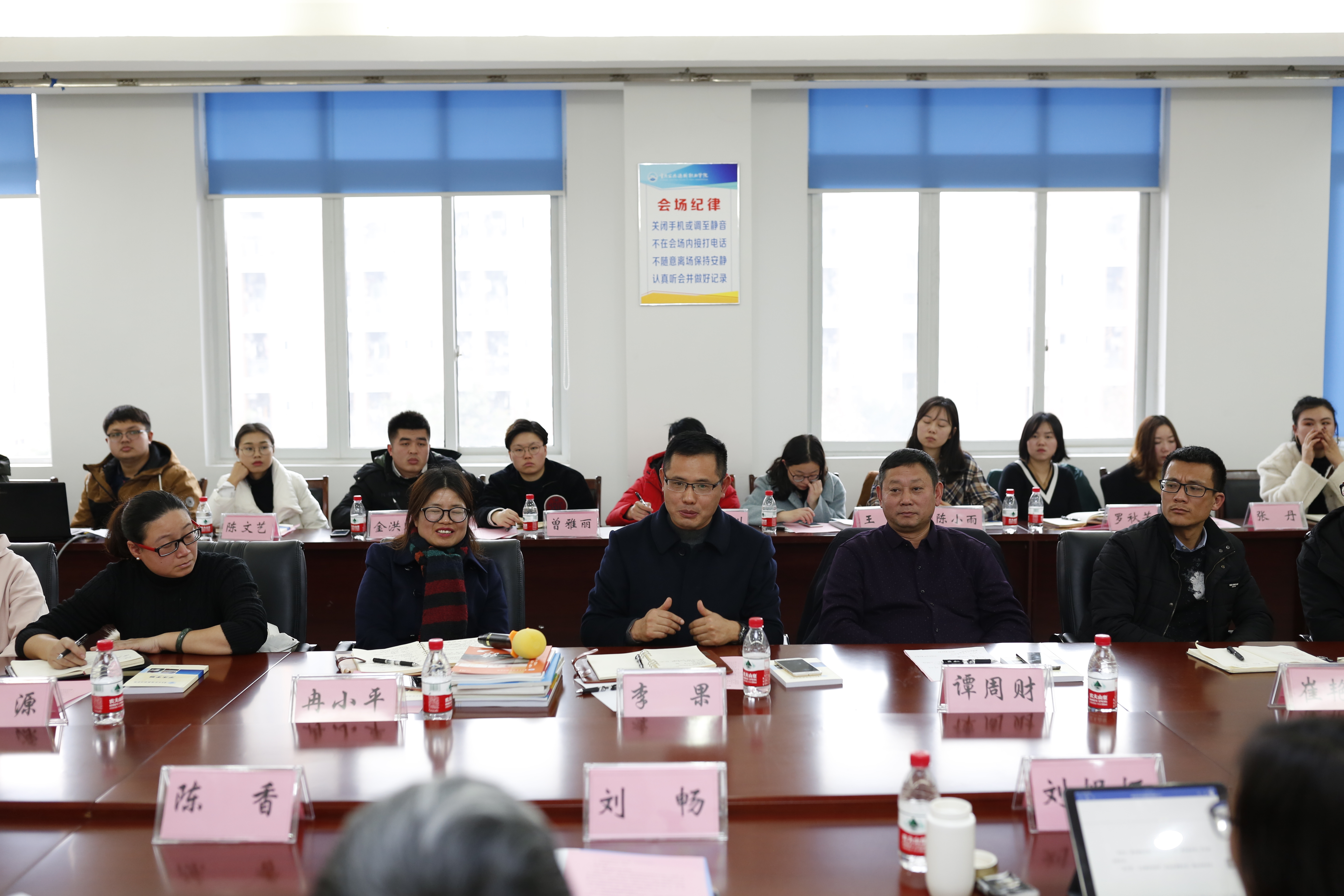 随后,房地产学院交流团一行抵达A401会议室,开展了深入的工作交流座谈,副院长刘畅、学生处处长刘妮娅、招就处就业指导中心主任陈香、党群工作处负责人万巧、运输贸易系党总支书记曾庆东、团委副书记彭余老师及各系学工办主任、团总支书记、辅导员代表一同参会。