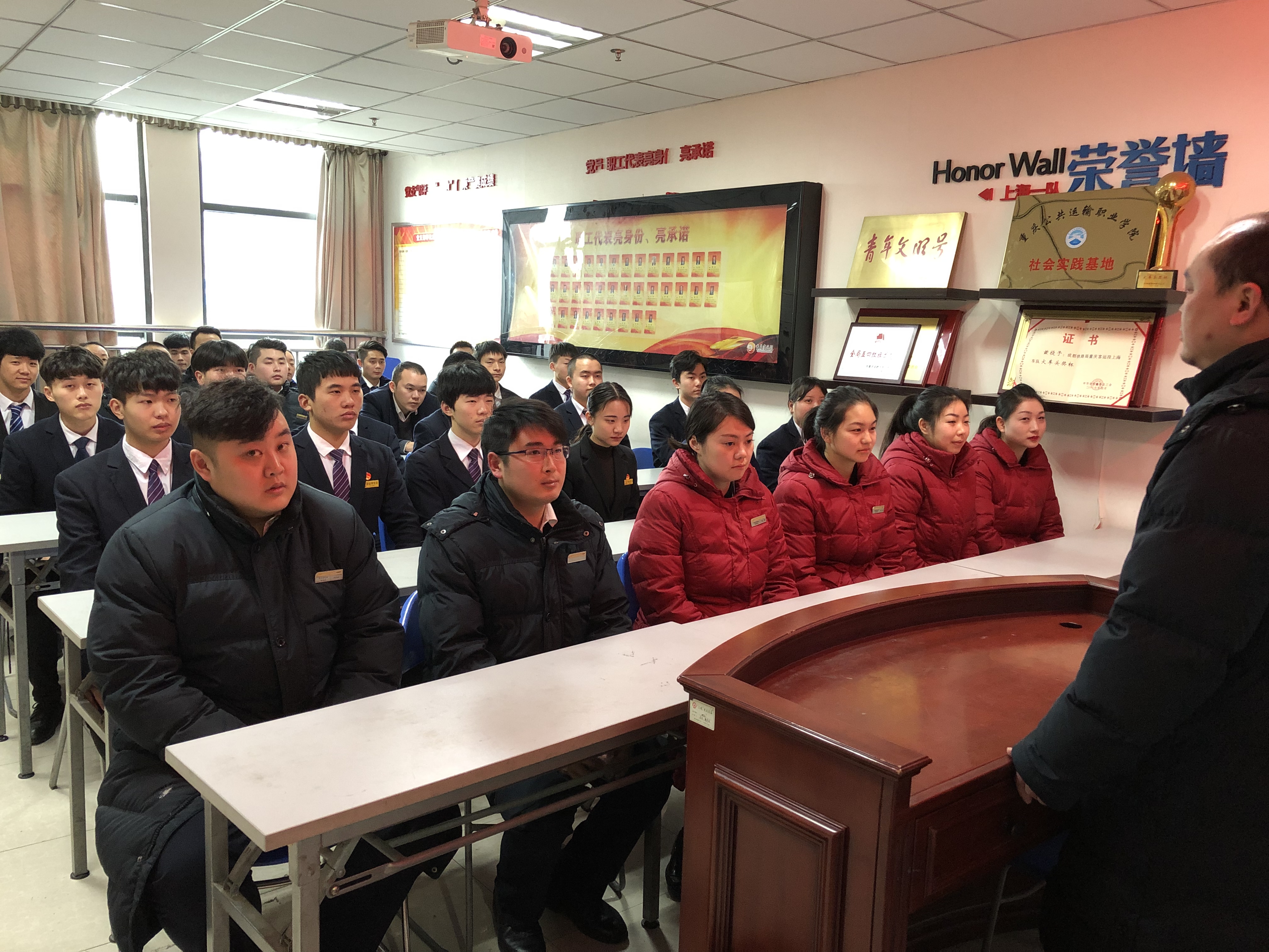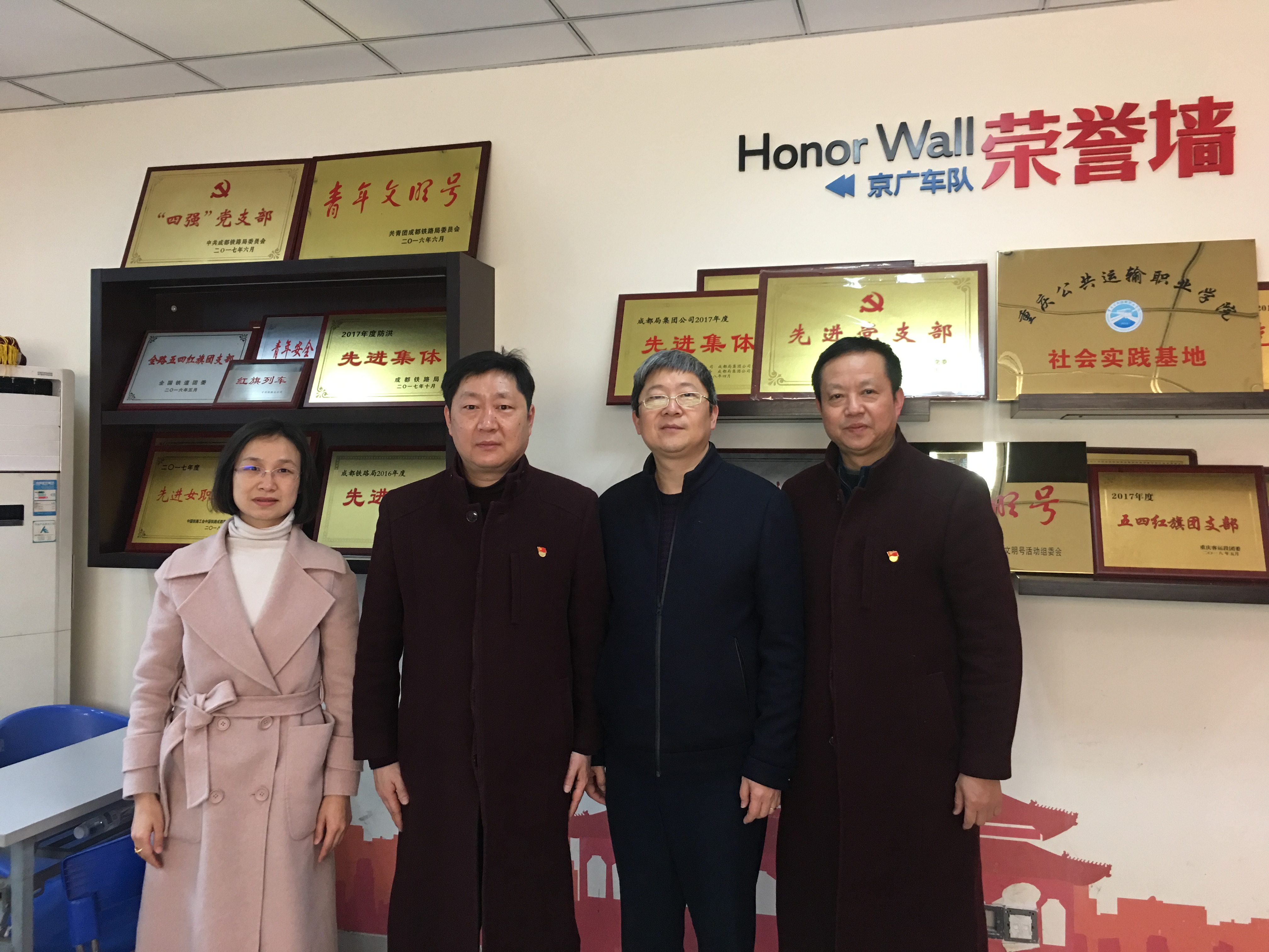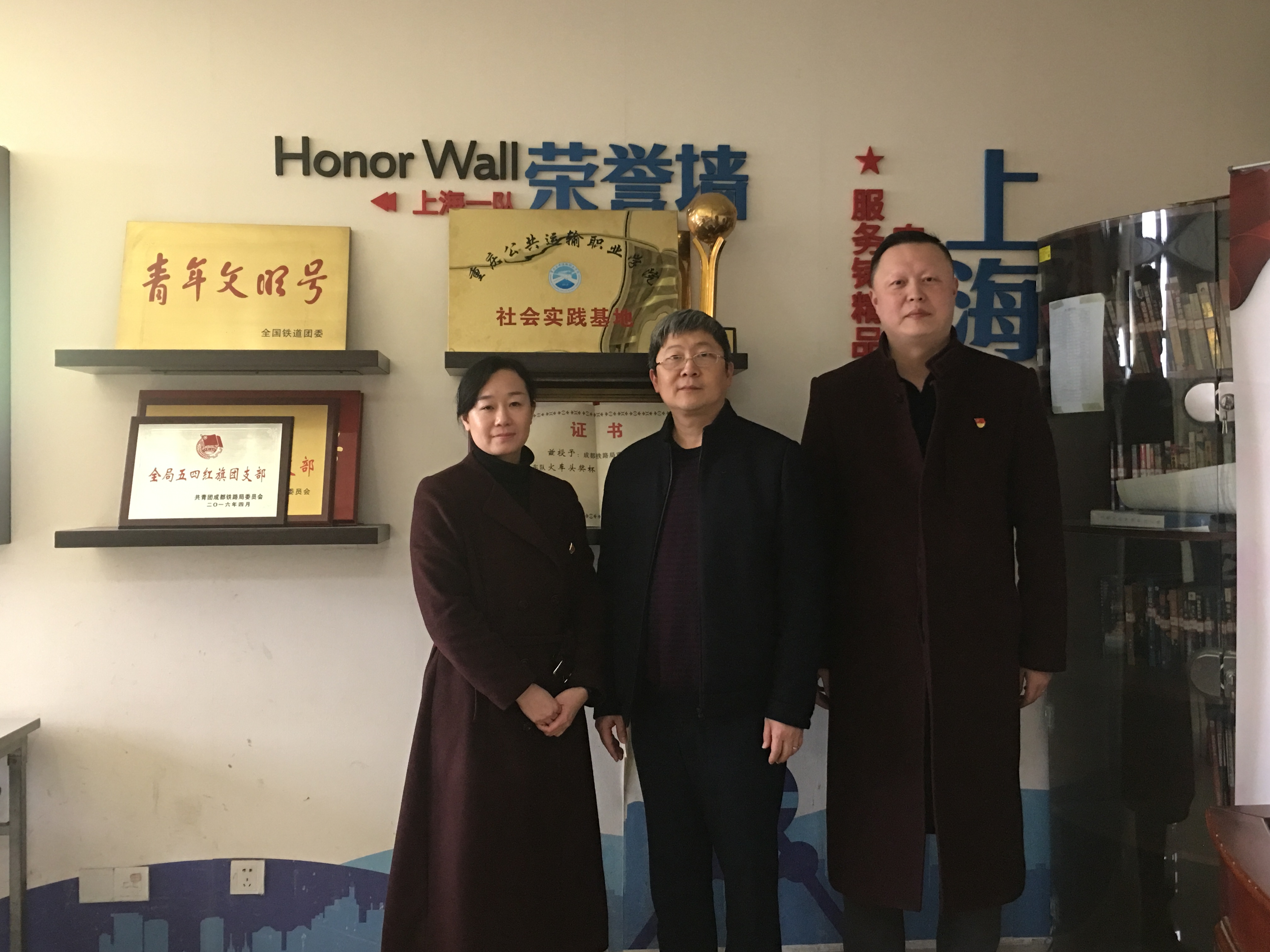 2018年12月25日,学院副院长刘畅一行来到重庆客运段,分别与北京车队、上海车队、京广车队各位领导共同挂牌了“学院社会实践基地”。在挂牌仪式上,客运段各车队领导对学院学生历年参与春运、暑运工作进行了回顾,对学院寒暑假社会实践工作做出了高度评价,对学院人才培养工作给出了充分肯定,并希望通过社会实践基地建设,进一步深化校企合作关系,共同为企业、为社会培养更多既具有扎实职业技能、又具备良好职业道德的未来铁路人。刘院长也代表学院对长期以来客运段各车队给予学院社会实践工作的大力支持表示衷心感谢,并期望以社会实践基地建设为契机,将企业员工岗位标准、企业生产管理文化融入人才培养全过程,进一步深化实践育人成效,扩大实践育人影响,助力学院内涵发展,实现学生优质就业。