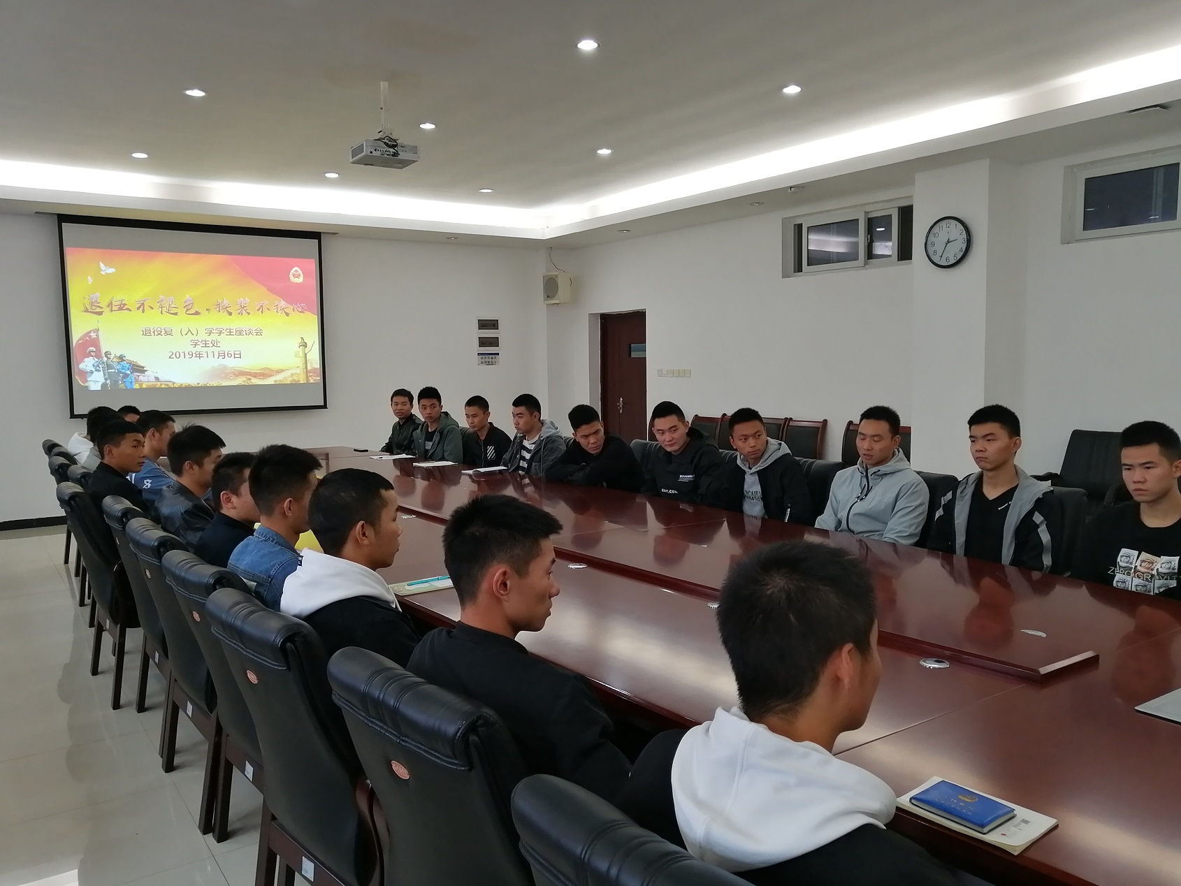 为帮助退役复(入)学学生能更快的适应大学生活,充分发扬其军人优良作风,在校园内引领一种懂规律、守纪律、听招呼的良好风气,学院组织了一场题为“退伍不褪色,换装不换心”的退役复学(入学)学生座谈会,学院安保处杨华、学生处刘金飞、潘宏,轨道车辆与机械系赵全勇四位老师出席了此次座谈。