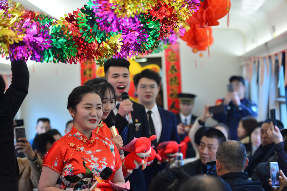 每年春节是亿万中国人合家团聚的时候,但也有不少人依然在归乡列车上。为了让旅客在列车上也能感受到浓浓的年味,k74次列车车厢内,公运师生精心组织,自编自导自演文艺节目,与现场的旅客互动,营造温馨的乘车环境,为回家过年的旅客送上节日祝福,带来欢乐与温暖。
