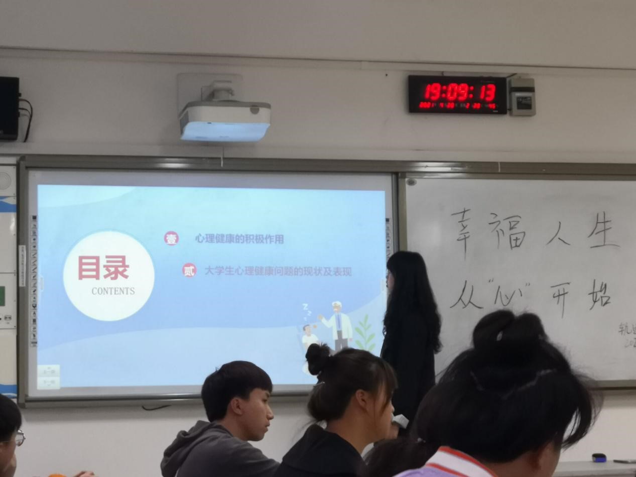 首先,由赵思媛同学讲解PPT,围绕着心理健康的积极作用、大学生心理健康问题的现状及表现、面对压力、如何管理情绪三个方面展开为同学们讲解了心理问题的好坏利弊,并讲述了如何保持一个好的心理,积极正确的缓解心理压力带来的负面影响;积极与同学们互动,向同学们提问、互动,活跃班会氛围。