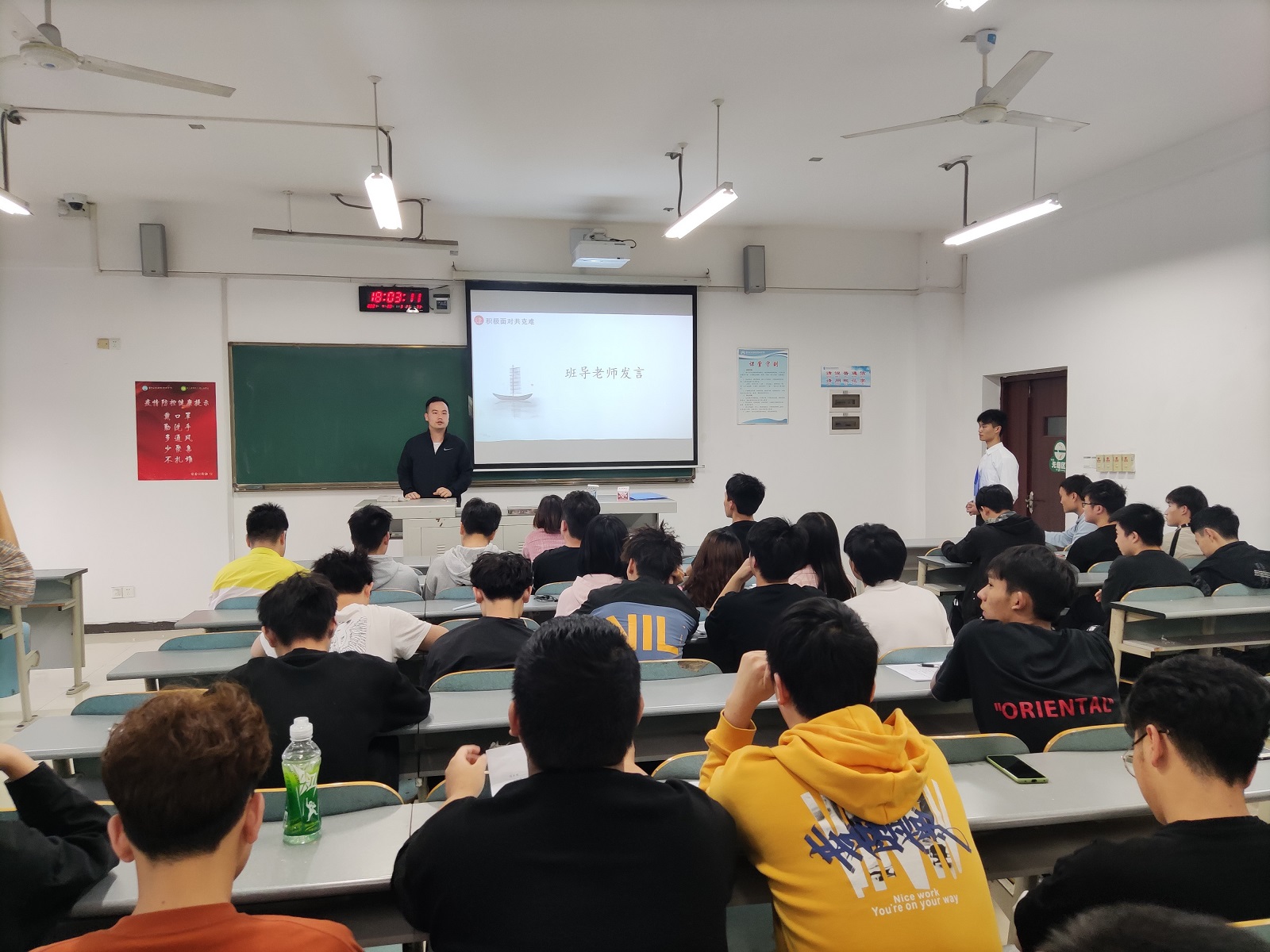 最后,班导师罗洪强老师,结合个人曾就业经历,向同学们传授面试的技巧与重点,希望同学们努力学习专业知识,锻造个人魅力,为面试蓄力续航;辅导员马秋容老师总结并表扬本次班会内容及形式,希望同学们借此机会重新审视自己,正确对待就业压力,深入了解自我,清楚自己的优劣势,抓紧时间为面试做准备,将个人自我介绍和简历制作提上日程,走在就业路的前线。
