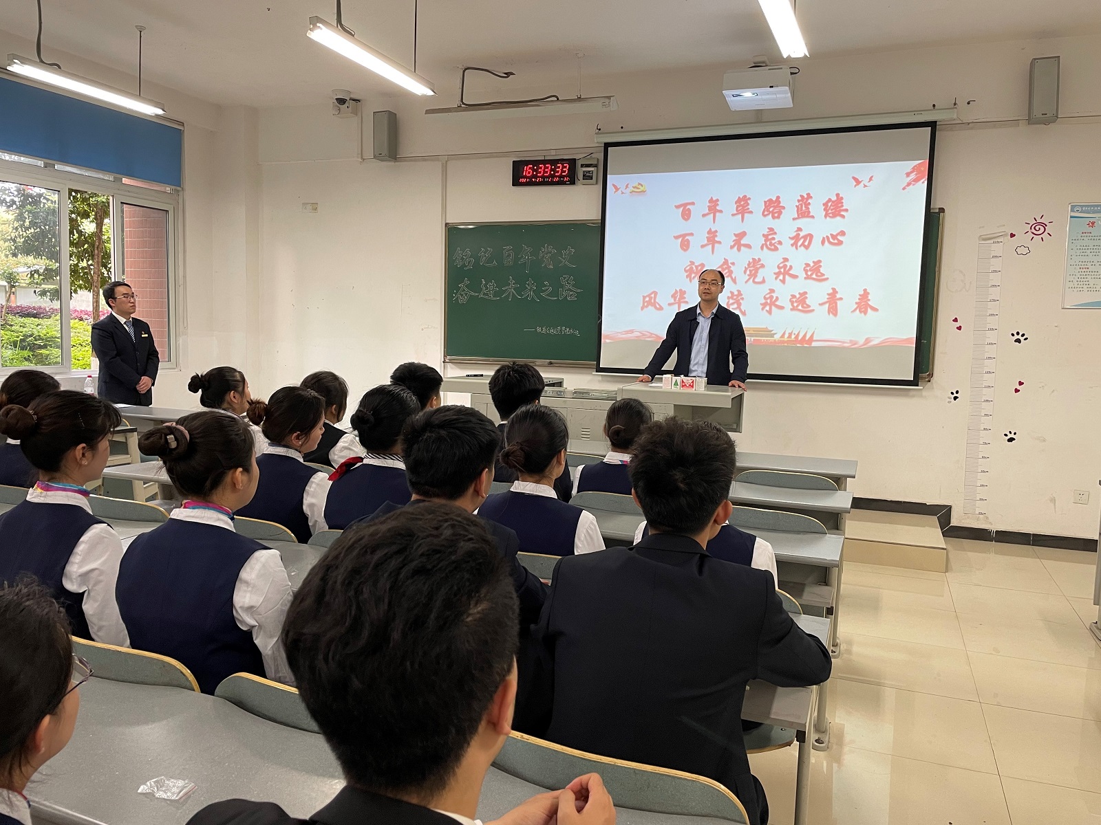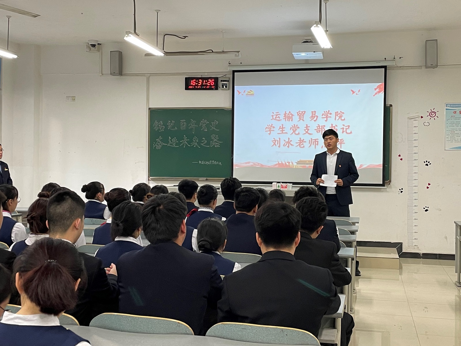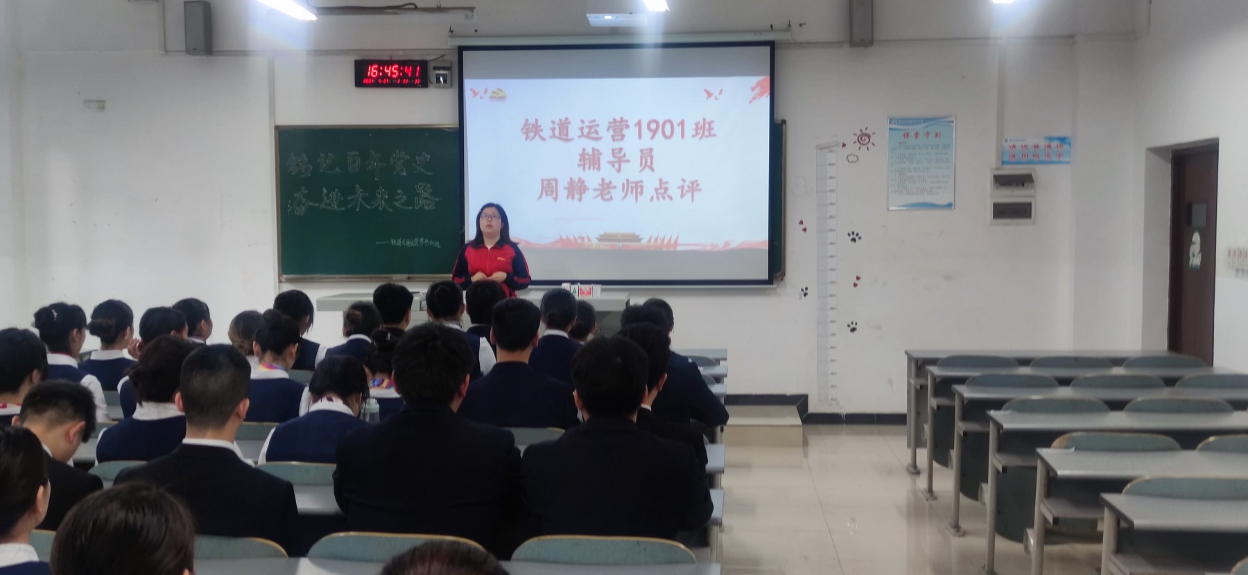 为了铭记党史,不忘初心,将民族精神融入到大学生活。2021年4月27日16点铁道交通运营管理在B103开展了主题班会。本次会议有幸邀请到了辅导员周静,班导师曹宁,运输贸易学院团支书刘冰和运输贸易系党总支书记曾庆东。