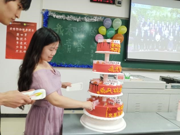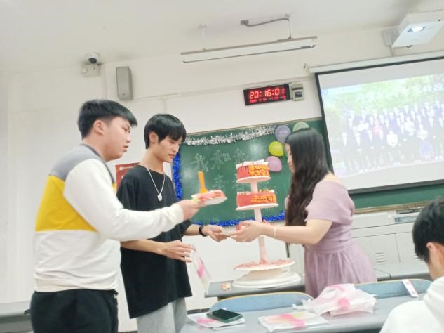 本次班会由辅导员付灿老师组织,文娱委员王宗沛主持开展。会上, 全体师生都可以清晰地看到那层次分明的蛋糕, 蛋糕上贴满了我们全班同学的名字;首先王宗沛同学为我们大家放送了一个我们全班的平时生活的视频,由全班同学共同提供的素材。之后开展了一项有游戏——根据所说特征猜人名,这个环节极大的带动了同学们气氛。之后又开展爆气球等游戏环节,胜利者有机会获得红包。倒数第二个环节——毕业感言,发言即可获取红包,气氛颇为热闹。最后,由付灿老师为我们全班分切蛋糕,气氛十分欢快。