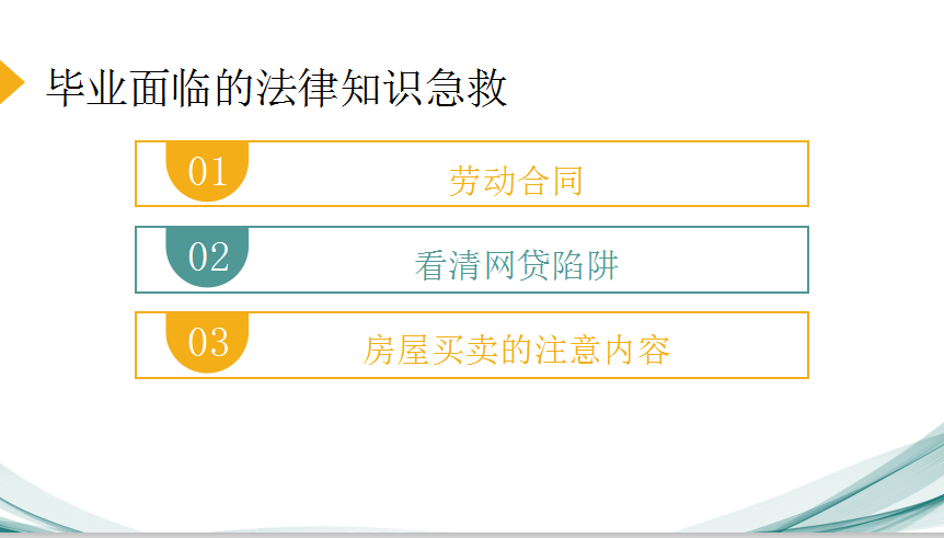 本次班会主要分为劳动合同、看清网贷陷阱、房屋买卖的注意内容以及毕业的注意事项。首先讲解了劳动合同,找工作必须先了解工作内容、工作条件、工作地点、职业危害、安全生产状况、劳动报酬以及科普了各种劳动法律。其次讲解了网贷陷阱,通过列举网贷受害者的案列,强调不要借!免费的午餐不要相信,要理性消费,绝不以贷养贷以及陷入恶性循环尽快求助。最后讲解了房屋的买卖,主要强调了买房前要有全方位的了解,签订合同时要细读熟知所有规定,如果遇到问题要学会用法律武器保护自己。
