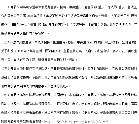 首先要求全体同学开展深学笃用习近平法治思想宣讲。按照《中共重庆市委宣传部重庆市司法局重庆市普法工作办公室关于开展2022年度重庆市深学笃用习近平法治思想宣讲的通知》要求,“学习新思想展现新作为喜迎二十大”微宣讲活动,请所有同学关注“学习强国”上的宣讲活动,并学习先进人物,了解革命先烈伟大牺牲与斗争精神;其次,开展“美好生活.民法典相伴”主题宣传活动。按照《中央宣传部司法部农业农村部全国普法办关于印发<2022年“美好生活.民法典相伴”主题宣传方案>的通知》和全部统一要求, 以“美好生活,民法典相伴”为主题,班级开展各类相关线上活动。最后,开展“莎姐”精品法治视频课进校园活动。市检察院组织开展了“莎姐”精品法治视频课评选活动,推荐出一批精品法治视频微课,内容涉及幼儿自护、未成年人保护、预防未成年人犯罪、家庭教育、校园安全以等法治知识。班级同学可在线自主观看。(观看方式: 登录重庆市教育委员会门户网站专题专栏中教育法治专栏。网址: http://jw. cq. gov. cn/jygz/jyfz/)。
