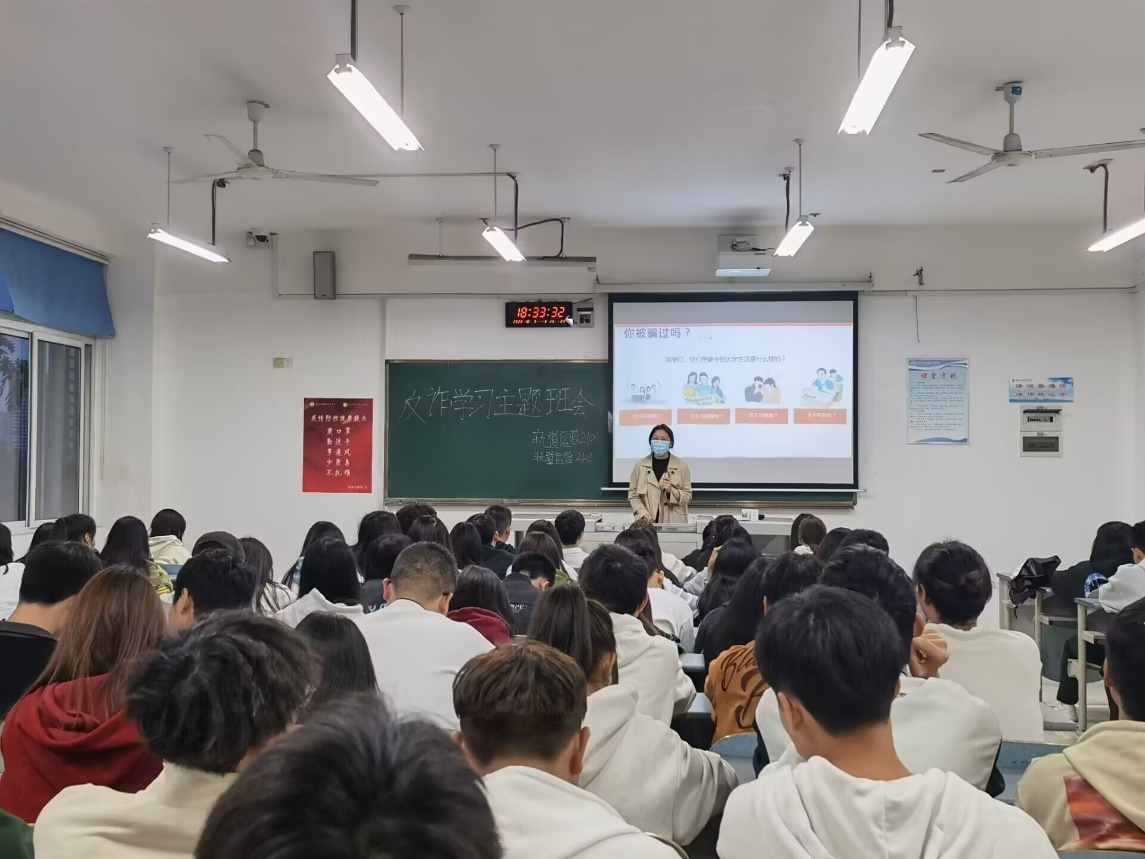 为增强大学生反诈防骗意识,加强大学生在生活中自我预防、自我保护、自我应对的能力,深入推进平安校园建设,运输贸易学院轨道运营2101班和轨道运营2102班于2022年10月9日晚自习时间,在主校区教学楼B507开展了“全民反诈进校园”主题班会。