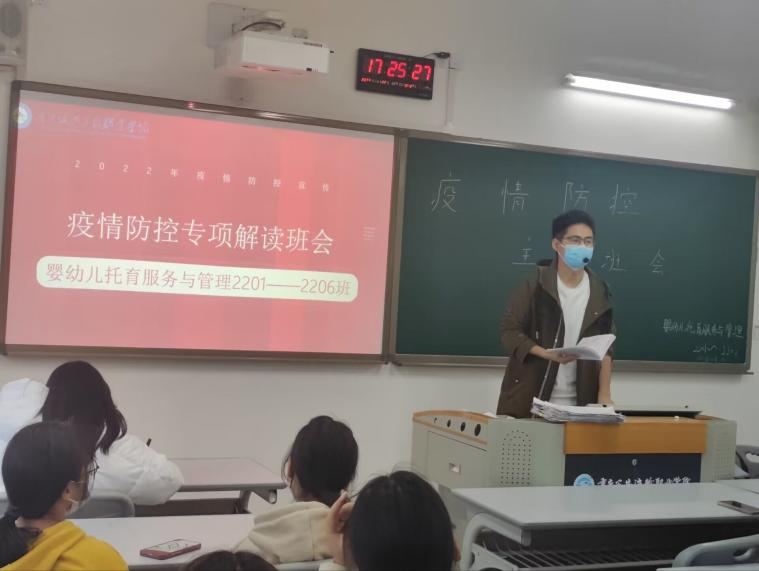 为做好校园疫情防控宣传主题班会。2022年11月13日,婴幼儿托育服务与管理专业进行了疫情防控主题教育班会,本次班会由辅导员李龙老师主持。