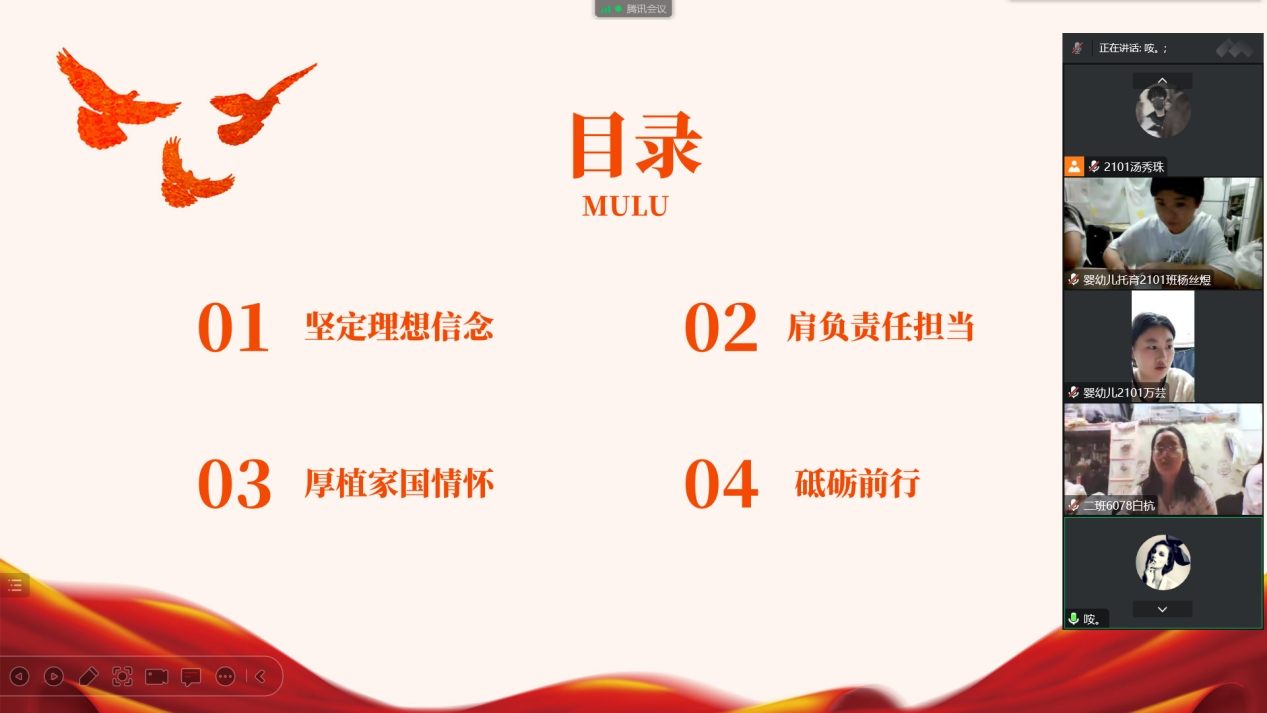 为进一步引导学生坚守抗疫信心,坚定理想信念,厚植家国情怀,激发爱国力行的责任担当和砥砺报国的初心使命。公共管理学院婴幼儿托育服务与管理全体成员在线上召开“坚定理想信念、厚植家国情怀”主题班会。