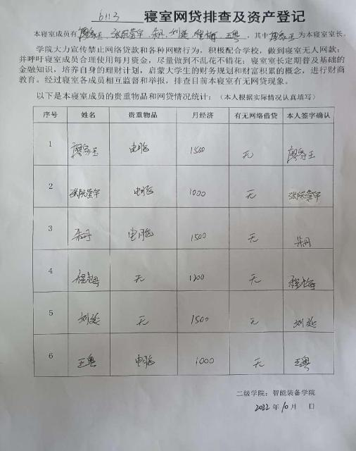 课后,安排学生干部走入学生寝室开展宣传和排查工作,让同学们以寝室为单位,填写网贷排查表,进一步推进相关工作落实落地,保障和维护广大同学的合法权益和财产安全。