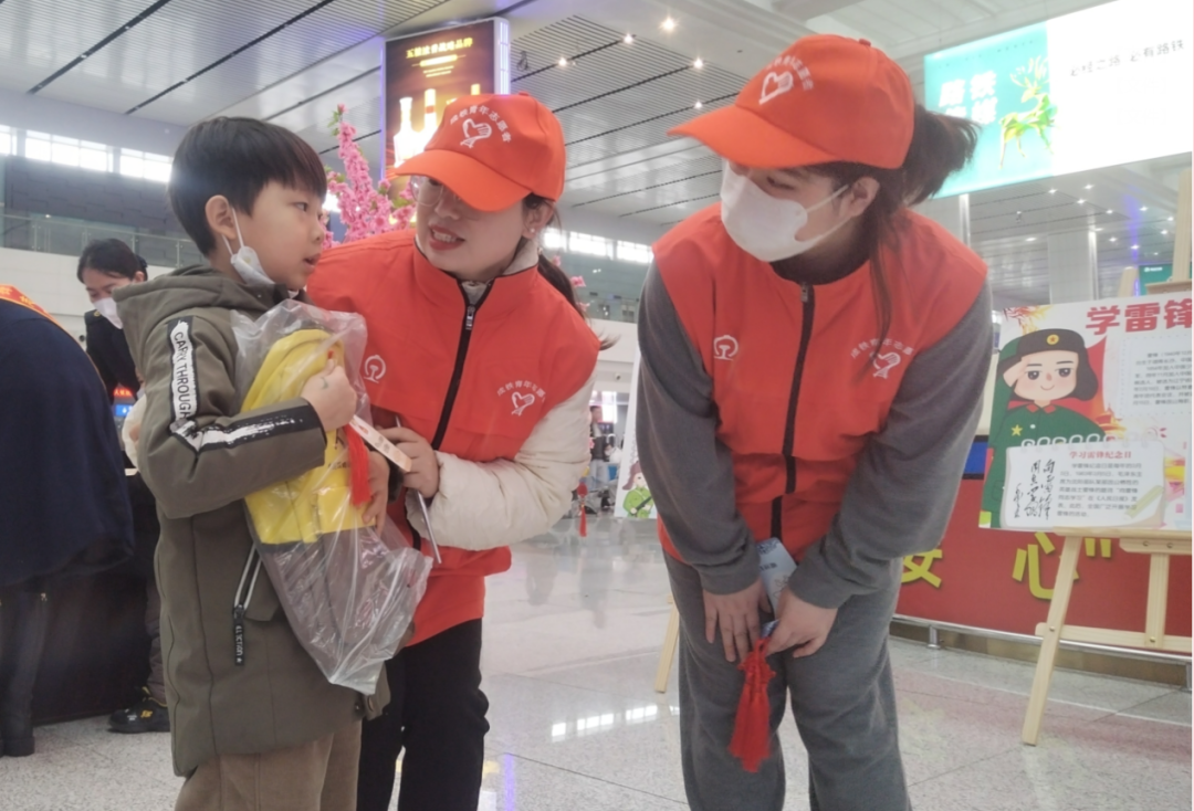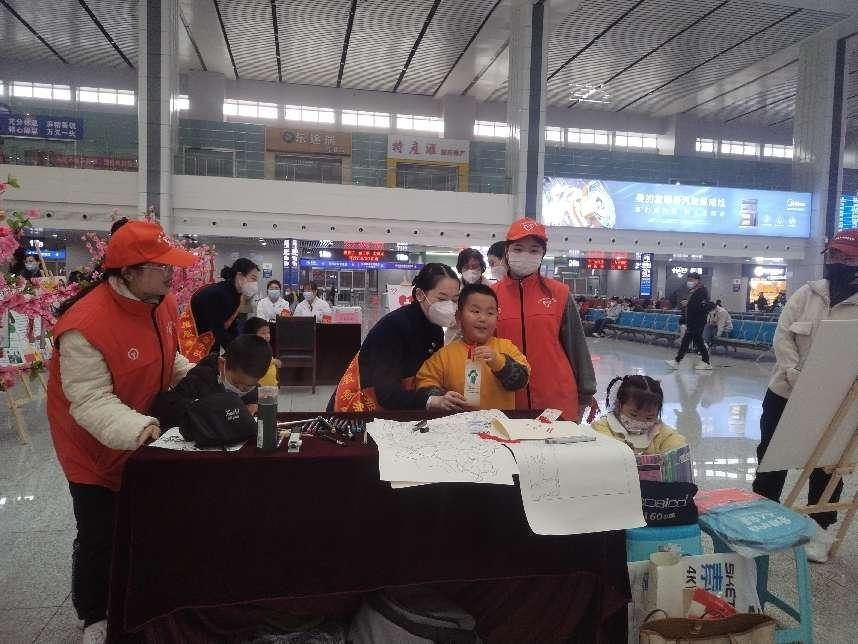 ▲志愿者与重庆北站旅客共同描绘“新时代雷锋精神”