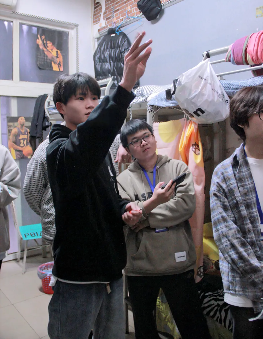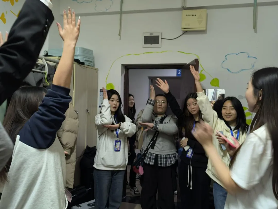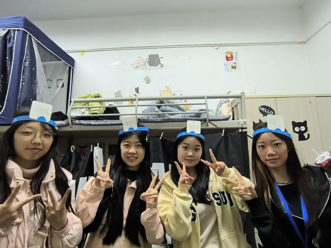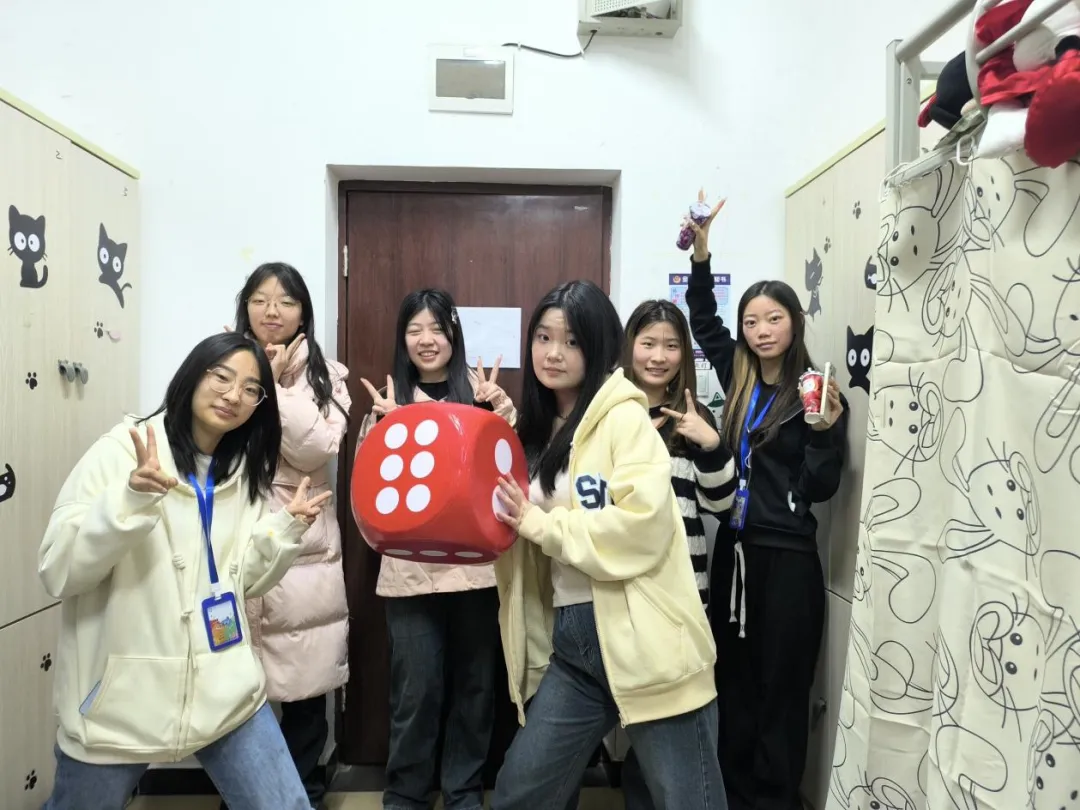 本次活动助力团工作人员分成了A、B两组,分别进入男、女生寝室,和自主报名的寝室团一起进行游戏挑战,本次挑战赛采取三局两胜制,寝室团随机掷骰子决定游戏模式,若寝室团赢得比赛则可获得精美礼品,若挑战失败则需配合拍摄心理健康科普小视频,并通过社交软件进行转发宣传。在心理中心的两位心理老师的带领下,助力团成员分别走访了B438、B440、B441、B509、A163、A101、C132共7个寝室,通过逛三园、睡眠知识问答赛、扔飞镖、关键词大挑战、戴高帽等多种游互动挑战,伴随着无数的欢声笑语,与寝室同学度过了欢乐的游戏时光,也引来周围寝室同学的频频观望与点赞。
