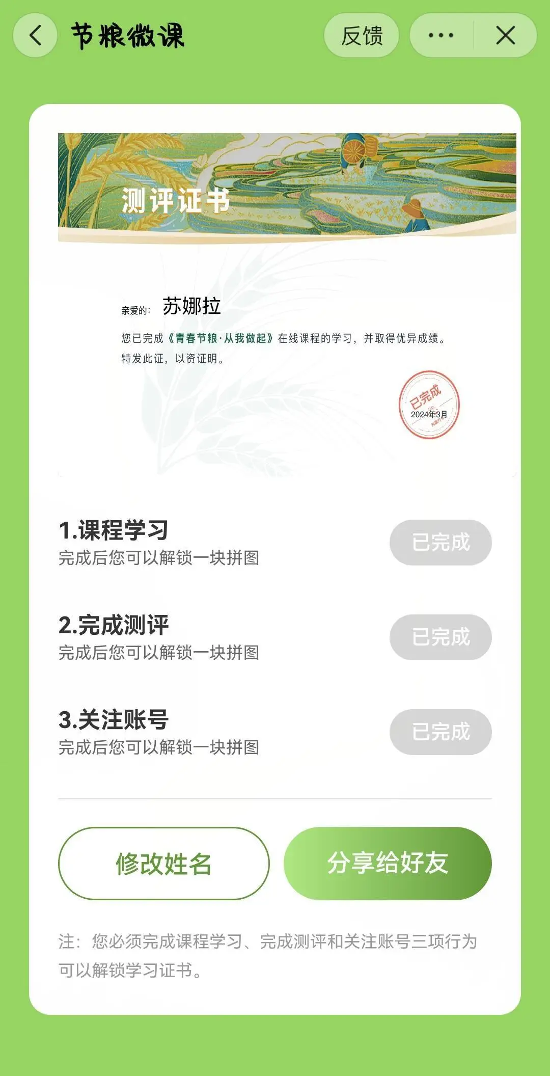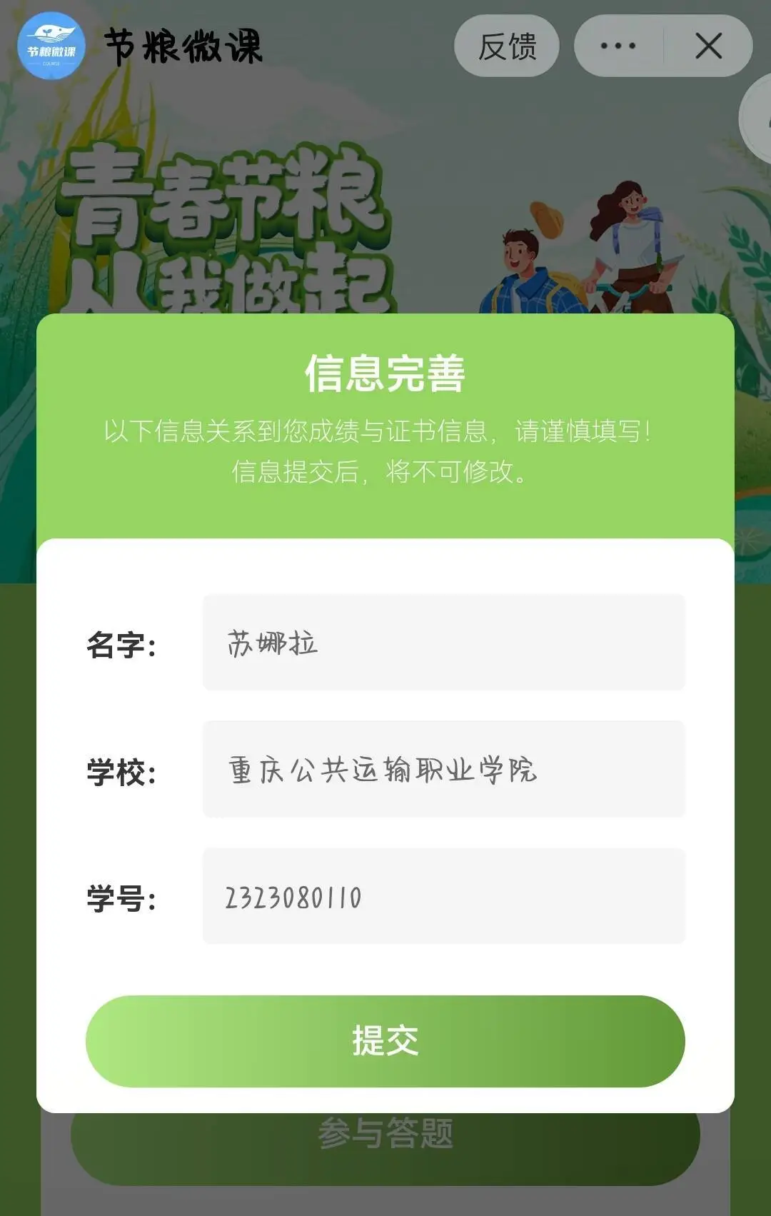 2.参与的同学需保存截图(截图如下)上传至“青春节粮,从我做起”活动QQ群内留存。