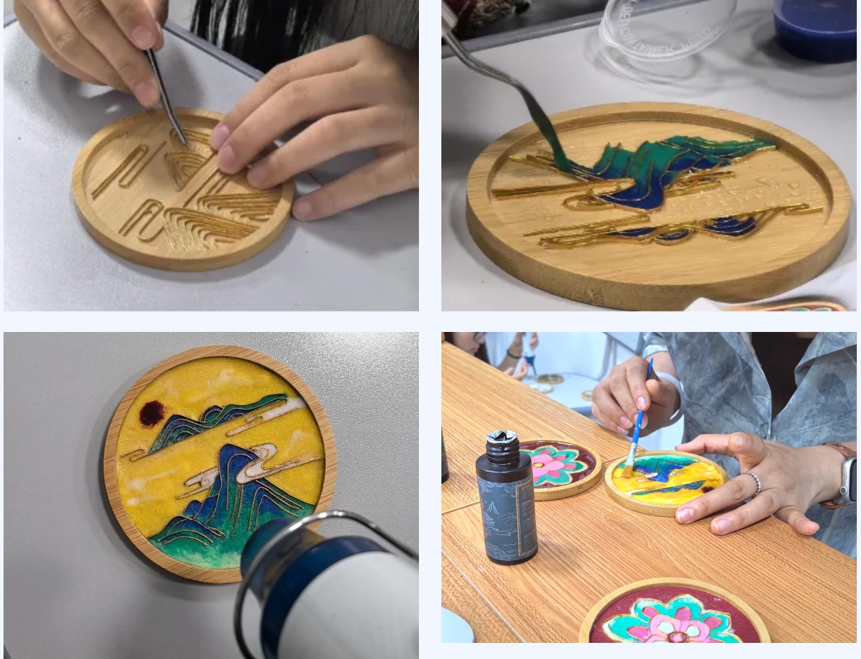 同学们在活动中学习了掐丝珐琅景泰蓝切裁铜板、锤揲制胎、制丝掐丝、粘丝作画、点蓝、固蓝、打磨抛光、表面镀金等工艺步骤,并上手体验了掐丝、粘丝作画、点蓝、烘蓝等流程,沉浸式体验到了掐丝珐琅这项非遗技艺的独特魅力,并产出了一个个美轮美奂、精雕细琢的精美作品。