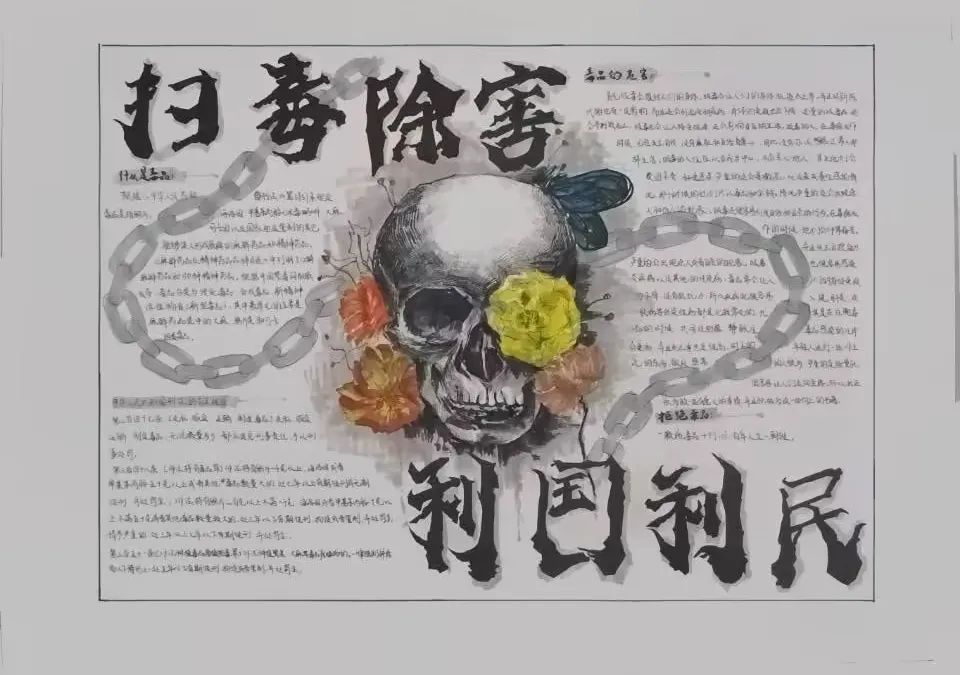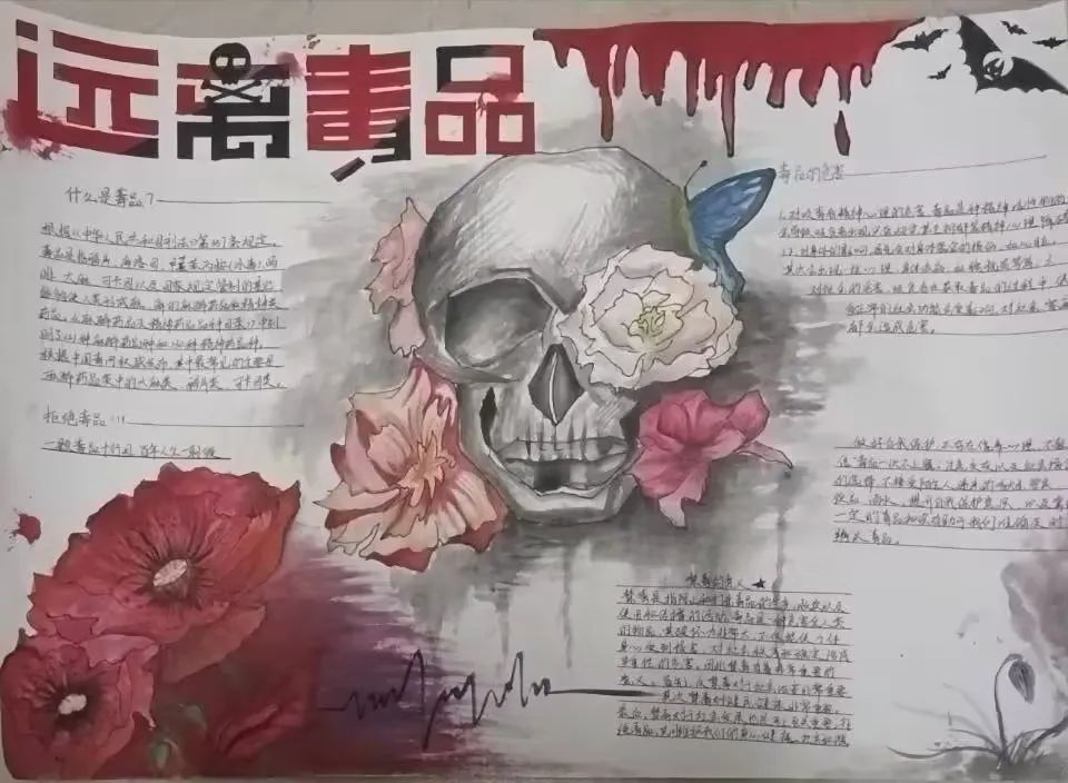 作品介绍:主要的构思是想体现毒品的危害,所以在纸张中央画了一个巨大的骷髅头。在骷髅头的眼球以及脸颊画上了盛开的罂粟花以及蝴蝶,给人带来视觉冲突,使主题明确内容一目了然。手抄报整体是由黑红灰三个颜色为主体,标题《远离毒品》也利用水彩画上了血迹和小骷髅,传播出毒品对人来说上瘾且致命。图上的罂粟花被称为世界上最美丽的花朵之一,花朵艳丽,香气浓郁,但它美丽的背后却是万丈深渊,就如同毒品,一旦沾染便万劫不复,给你带来甜头的同时,正在悄然侵蚀掉我们的身体,所以本次作品主要想表达的就是真爱生命,远离毒品。