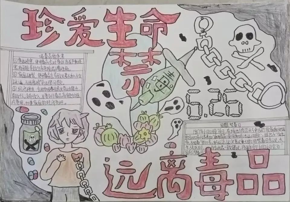 在制作手抄报的过程中,我充分发挥了自己的创意和想象力,将禁毒知识和理念融入到设计中。我选择了醒目的颜色和图案,力求吸引人们的眼球,引起他们的关注。骷髅头代表着死亡,意味着人如果沾染毒品就代表着死亡就在不久后。用铁链锁着,代表着人对毒品会有极强的依赖性,所以难以挣脱。铁链锁着骷髅,也就意味着沾染了毒品,就代表着死亡,所以以此来宣传远离毒品。毒品不仅会对个人的身心健康造成极大的损害,还会破坏家庭和社会的稳定。这让我更加坚定了参与禁毒宣传的决心。