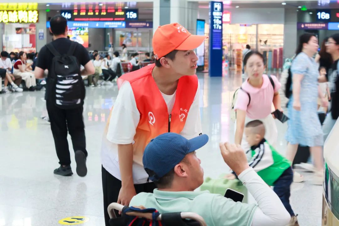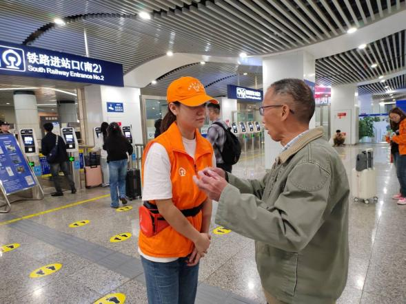 车站是一个忙碌并且交织着离别与重逢的地方。作为志愿者,我有幸见证了旅客的来往,更以微薄之力为旅客带来一份温暖和便捷。我的日常工作就是穿梭在拥挤的人群中,引导旅客前往正确的检票口、帮旅客提行李、为旅客解答疑问。虽然任务琐碎,但每一个微笑、每一次感谢,都让我感到无比珍贵。6月8日,一位年迈的爷爷带着沉重的行李,步履阑珊,需要前往K1258次列车。我见状主动上前指引,并成功与车上工作人员进行交接,帮助爷爷乘上列车。当爷爷对我挥手说谢谢时,那一刻我懂得了志愿者奉献他人的意义,有很多老年人和残障人士因为行动不便或身体缺陷而乘车困难,但在我们的帮助下他们都成功登上了列车,这就是志愿者的意义所在。