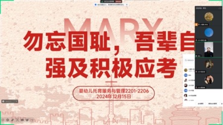 为使学生铭记并了解历史,培养其以实际行动展现爱国情怀与责任担当。2024年12月15日,婴幼儿托育服务与管理专业2201至2206班的学生们在腾讯会议平台共同举办了以“勿忘国耻,吾辈自强”为主题的班会。