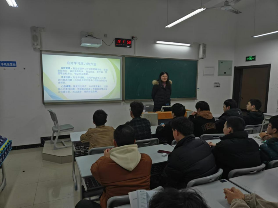 为了缓解同学们的心理压力。2024年12月9日。汽车维修班、汽车制造班、智能维修班在教室B402展开了“学业压力”主题教育班会。本次班会由辅导员袁佐霄主讲