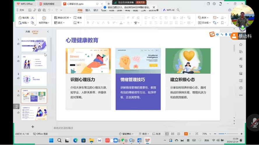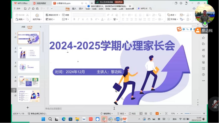此外,黎功科老师还介绍了学生在校情况。黎老师详细说明了学生们的学习进度、课堂表现以及参与校园活动的积极性等方面的情况。关于换专业问题,为家长和学生提供了详细的政策解读和指导建议,帮助他们了解换专业的条件和流程。期末考试相关事宜也得到了强调,提醒家长督促孩子合理安排复习时间,积极备考。