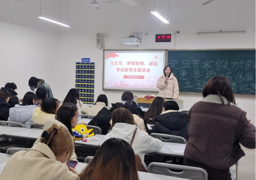 随着元旦节的临近,期末考试和寒假假期也即将到来,为了提升学生们的假期安全意识,营造诚信考试的考风考纪。婴幼儿托育服务与管理专业2403班和2404班于2024年12月29日下午在新校区B303-1教室举办了关于元旦节、寒假放假相关事项主题教育班会。