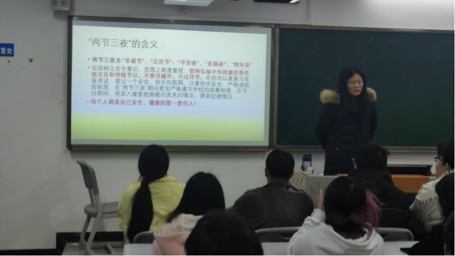 本次班会辅导员袁佐霄主讲。首先,辅导员袁佐霄强调传承中华优秀传统文化的意义,倡导理性对待外来节日,摒弃崇洋媚外思想,树立正确文化观,增强民族自豪感。随后,袁老师通过讲解安全事故案例,让同学们意识到节假日潜在安全隐患。他特别提醒,出行要严守交通规则,规避交通安全风险;在人员密集场所,要警惕踩踏事故,避免前往人员过度聚集之地。