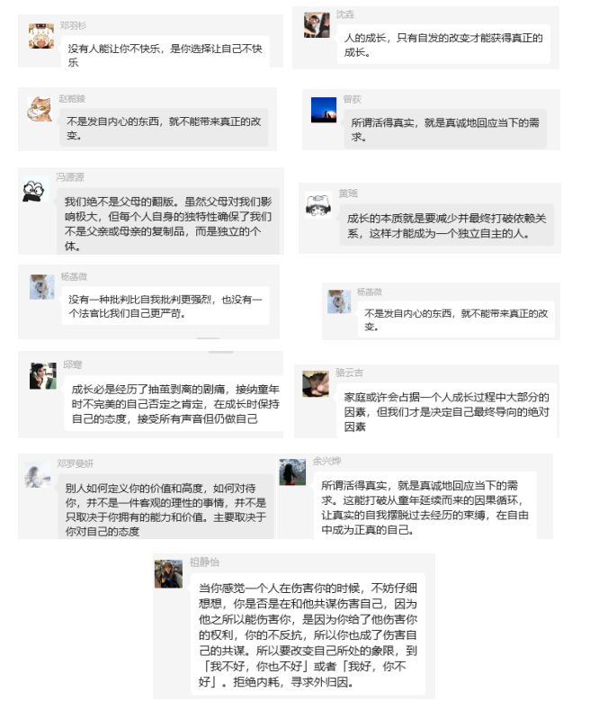 而 “关键概念剖析” 环节则将活动推向了知识的深度探索层面。主持人将书中如 “人生坐标”“情绪温度计”“儿童自我状态”“父母自我状态”“成人自我状态” 等核心关键概念一一拆解,抛出启发问题,迅速引发同学们的头脑风暴。同学们分组畅所欲言,有人从过往挫折找到方向,有人思考优化处事模式,共同分享着从书中汲取的智慧如何映照现实、启迪成长。