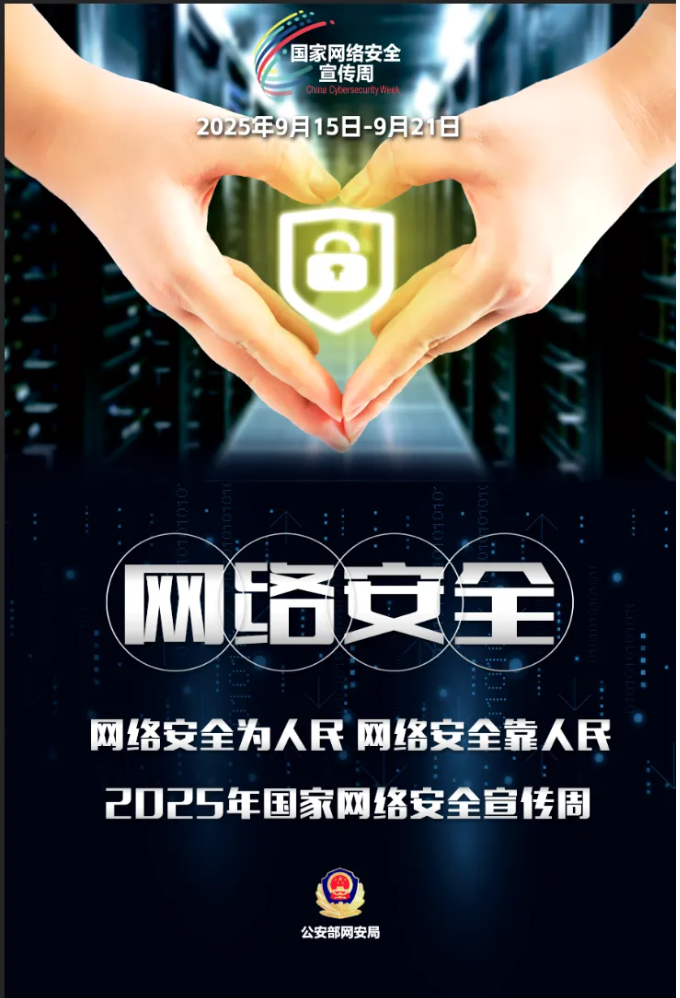 2025年9月15日至21日是国家网络安全宣传周,主题是“网络安全为人民,网络安全靠人民”。