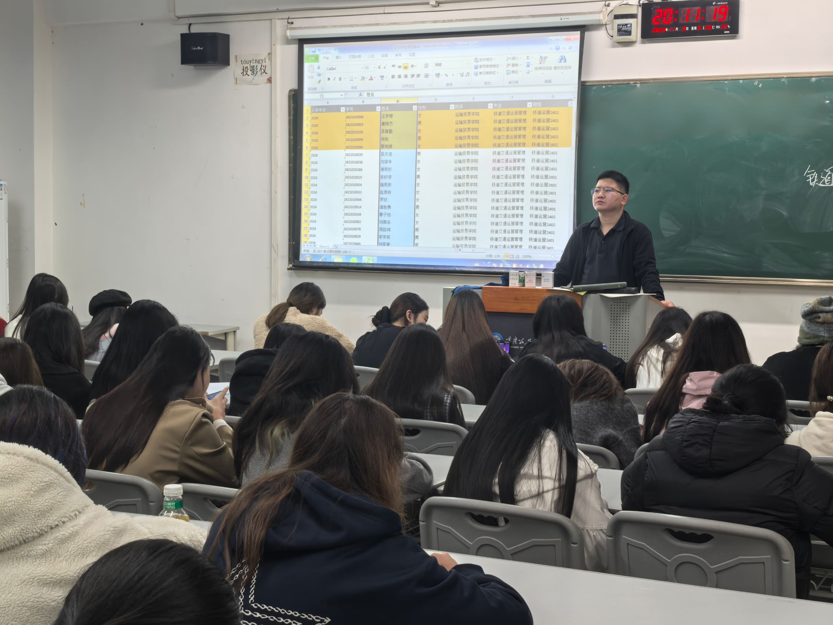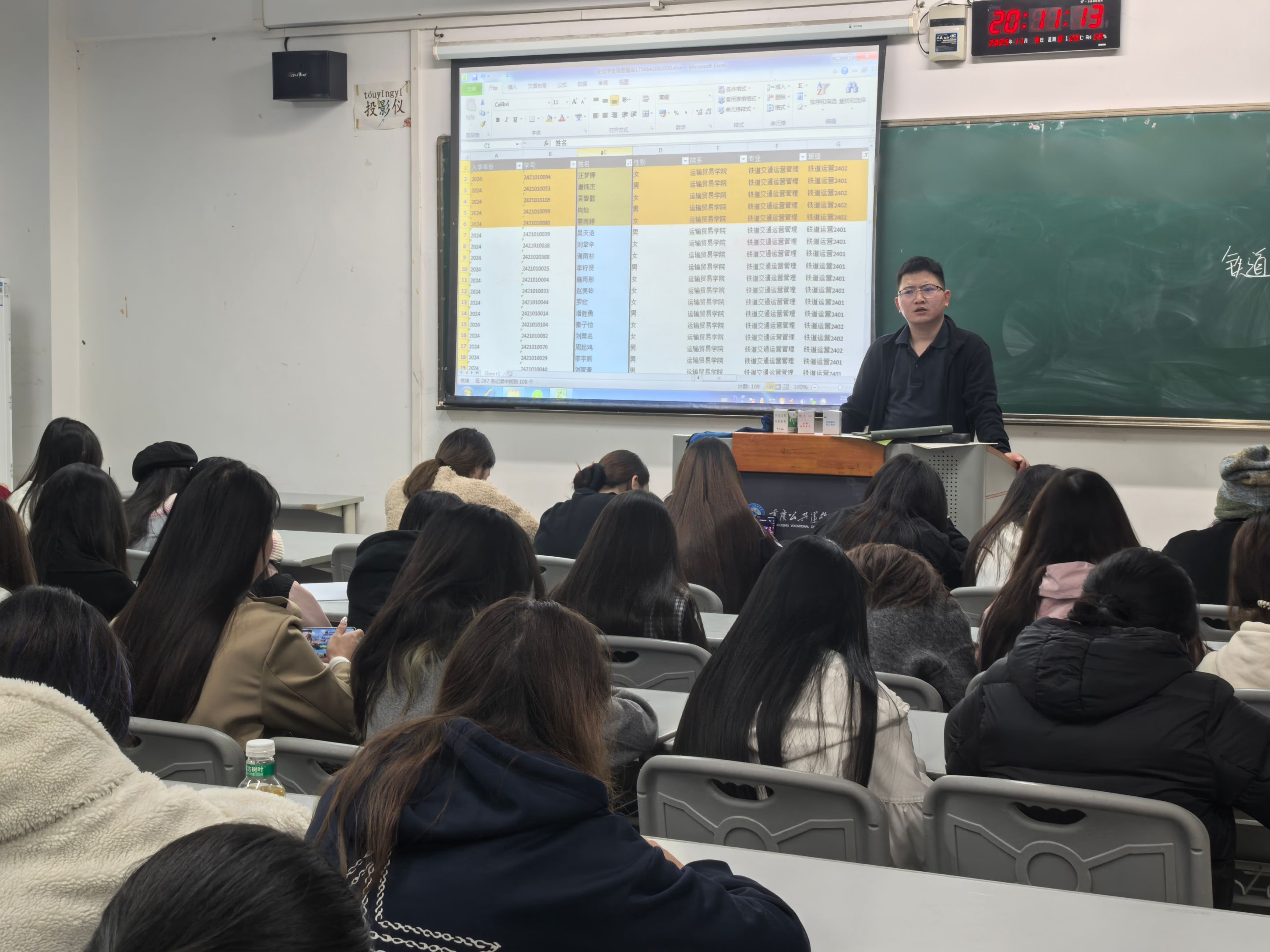 为贯彻落实国家学生资助政策、筑牢校园安全防线、规范学生日常管理,2025年11月9日晚,2024级铁道交通运营管理2401和2402班全体同学于老校区C205教室开展了“学费减免政策解读暨宿舍安全、请假规范”主题班会。
