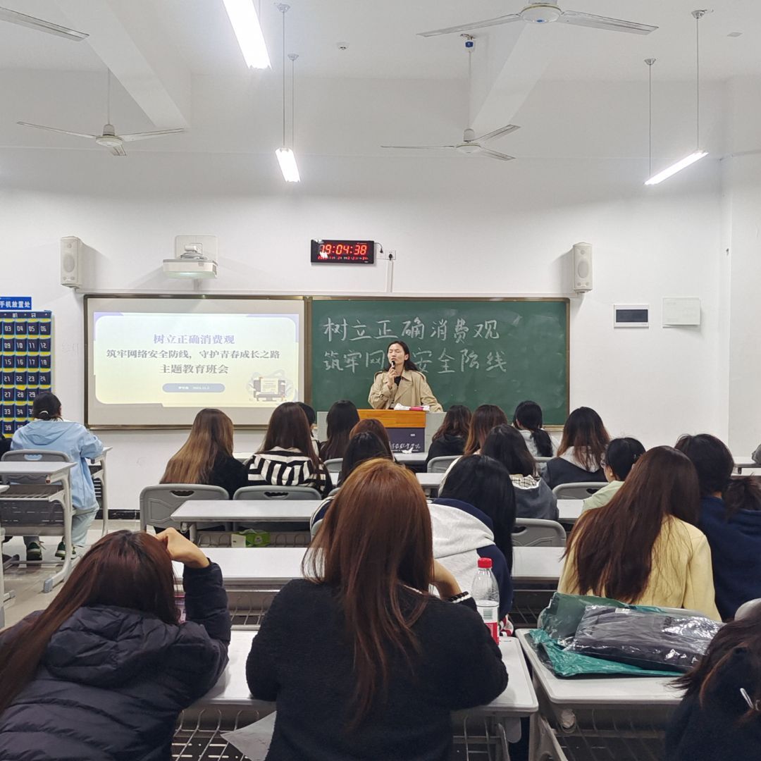为提高学生识别常见消费陷阱的能力,明确消费行为与个人需求及经济承受能力之间的合理关系,同时增强网络安全基础意识,保护个人信息并防范网络欺诈,2025年11月2日晚19时,2024级婴幼儿托育服务与管理专业2403班和2404班,在新校区B205 - 2教室联合举办了一场以“树立正确消费观,筑牢网络安全防线”为主题的教育班会。本次班会由罗雪梅老师担任主讲。