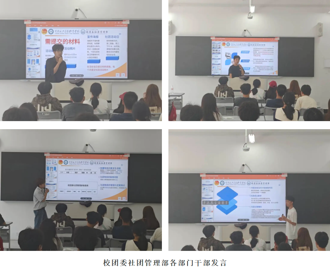 在交流环节,各部门干部对具体工作内容进行了详尽说明。例如,财案介绍了物资报表的制作流程;社团管理联系中心讲解了策划方案和班导师计划的收取和审核;对外宣传推广中心对策划方案、班导师计划的收取与审核规范作出说明;综合办公室介绍了社团的注册和活动方案申报等工作内容。各分部门干部的介绍让新干事对所处部门的工作有了更加深刻的了解。