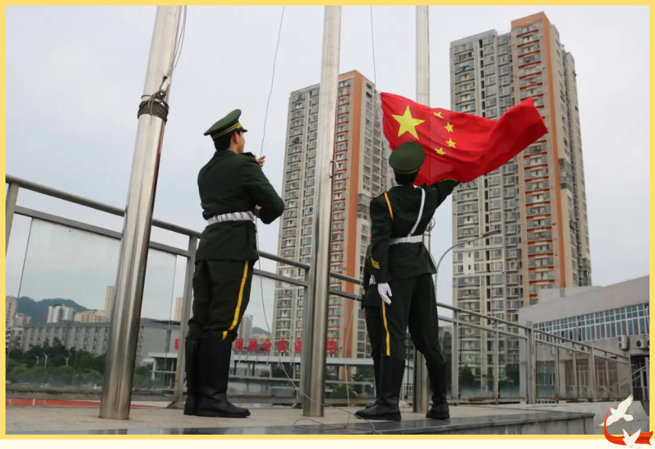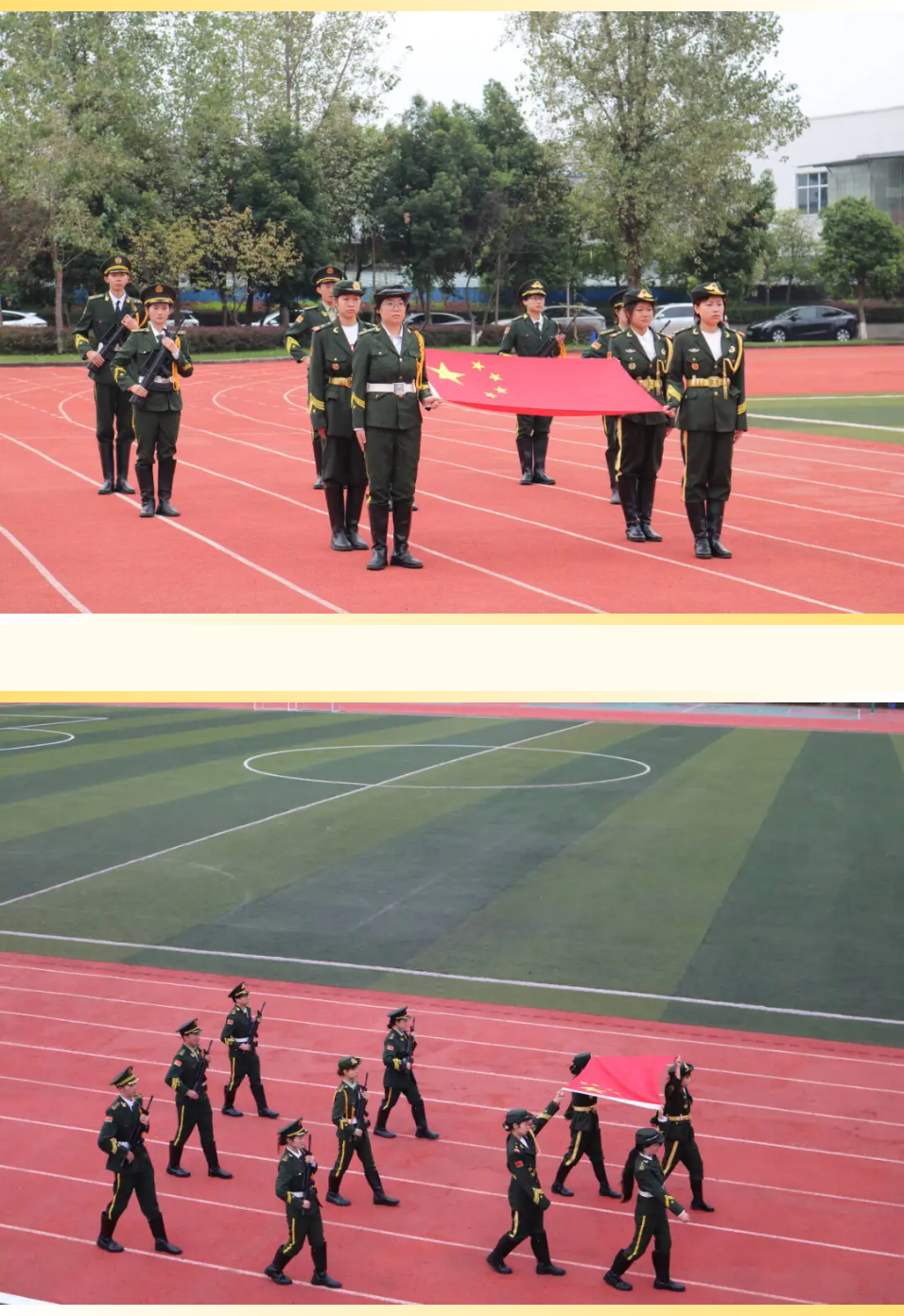 仪式现场,国旗护卫队队员身着统一制服,精神饱满、步伐铿锵稳稳地护送五星红旗走向升旗台,伴随《义勇军进行曲》的庄严旋律,现场师生肃立注目,见证国旗冉冉升起,赤诚的爱国情怀在每个人心中激荡。