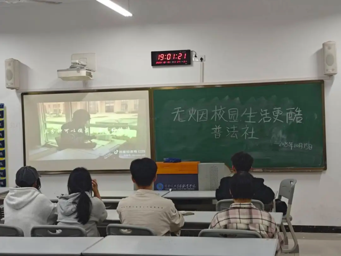 普法社的成员们有序地在教室进行观影学习,他们全神贯注地沉浸于影片之中,使心灵归于宁静,于光影交错间领悟健康的真谛,在无声的思考中领悟禁烟的价值。