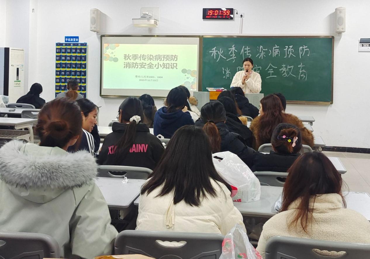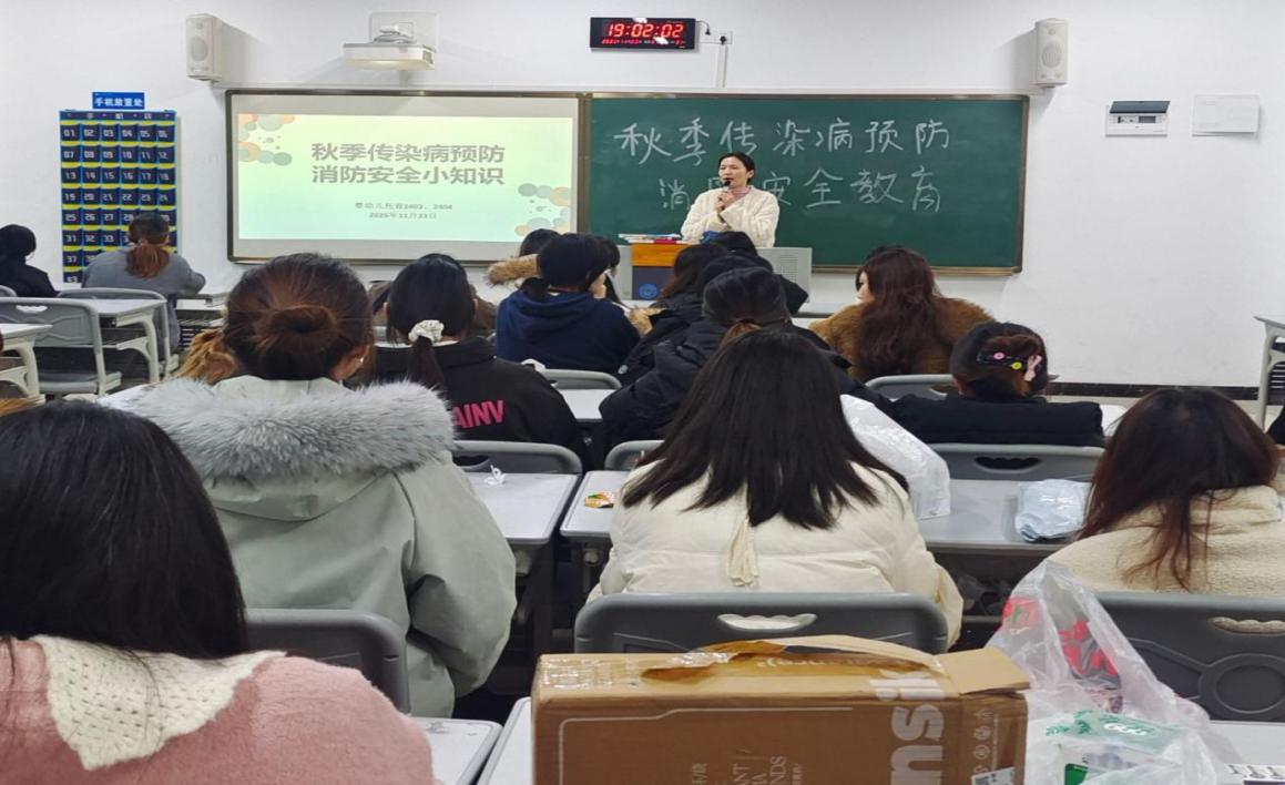 2025年11月23日19:00,2024级婴幼儿托育服务与管理2403班与2404班于新校区B205-2教室联合举办了“秋季传染病预防与消防安全教育”主题班会。