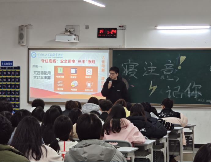 11月30日晚,工业设计、环境艺术、婴幼儿托育及社区管理专业全体学生在辅导员李龙老师的组织下,于新B206教室召开了寝室用电安全专题学习班会。