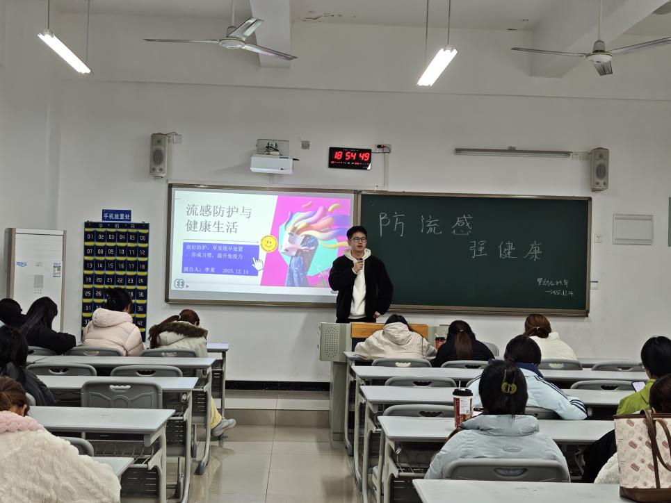 李龙老师结合校园生活实际,详细讲解了流感的传播途径、典型症状和科学预防措施。他强调,同学们应保持教室和宿舍经常通风换气,养成勤洗手、戴口罩的良好卫生习惯;同时合理安排作息,积极参加体育锻炼,增强体质,降低感染风险。此外,李老师特别指出吸烟的危害——吸烟会降低呼吸道抵抗力,大幅增加感染流感风险,呼吁同学们远离烟草,培养健康的生活方式。