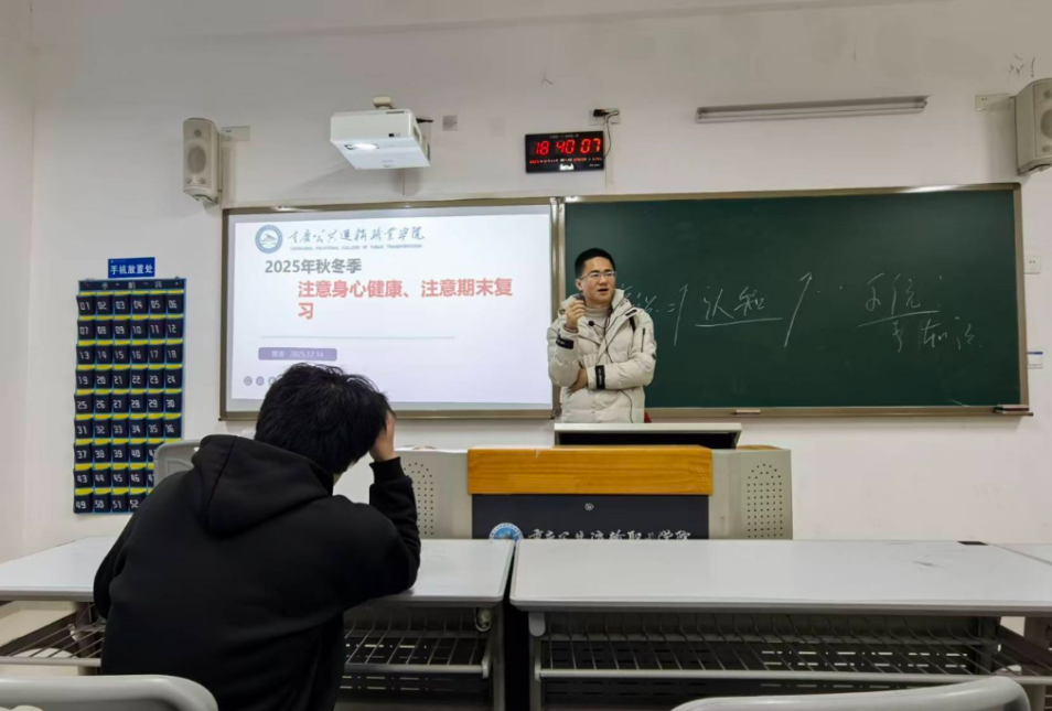 2025年12月14日,为帮助学生树立科学健康观念,培养良好的生活习惯,辅导员黄涛老师在新校区B201教室为2025级汽车专业学生开展了“注重身心健康”为主题的班会活动。