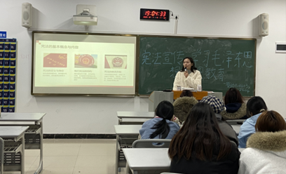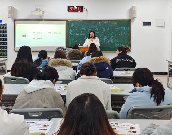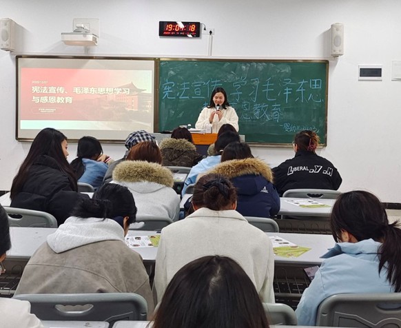 为深入学习贯彻宪法精神,传承弘扬毛泽东思想,厚植青年学生感恩情怀,落实立德树人根本任务,2025年12月7日19:00,24级婴幼儿托育服务与管理2403班、2404班在新校区B205-2教室联合开展“宪法宣传、毛泽东思想学习与感恩教育”主题班会。本次班会由罗雪梅老师主讲,两班全体同学参会。