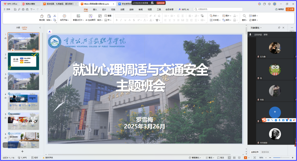 为帮助学生应对求职压力、强化出行安全意识,做好实习与就业阶段学生教育管理工作,2026年3月26 日,公共管理学院23级169人,以线上形式召开就业心理调适暨交通安全主题班会。本次班会由辅导员罗雪梅老师主持,全体相关班级学生参加。