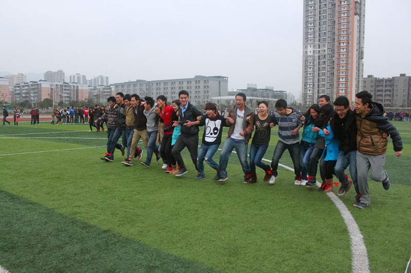 比赛在唐春林主任的精彩致辞下正式拉开帷幕,学生处丁汝崇处长及辅导员们也来到现场观看比赛,并为各班加油打气。比赛中同学们团结协助,努力拼搏,非常认真的完成每一个环节,各班自发组织的场外拉拉队也热情四射,不断的为场上队员呐喊助威,整个活动都笼罩在欢快愉悦的氛围之中。特别是其中的大型两人三足比赛最令人振奋,赛场上队友们齐心协力,场外拉拉队欢呼雀跃,使整个趣味运动会的气氛达到了高潮。