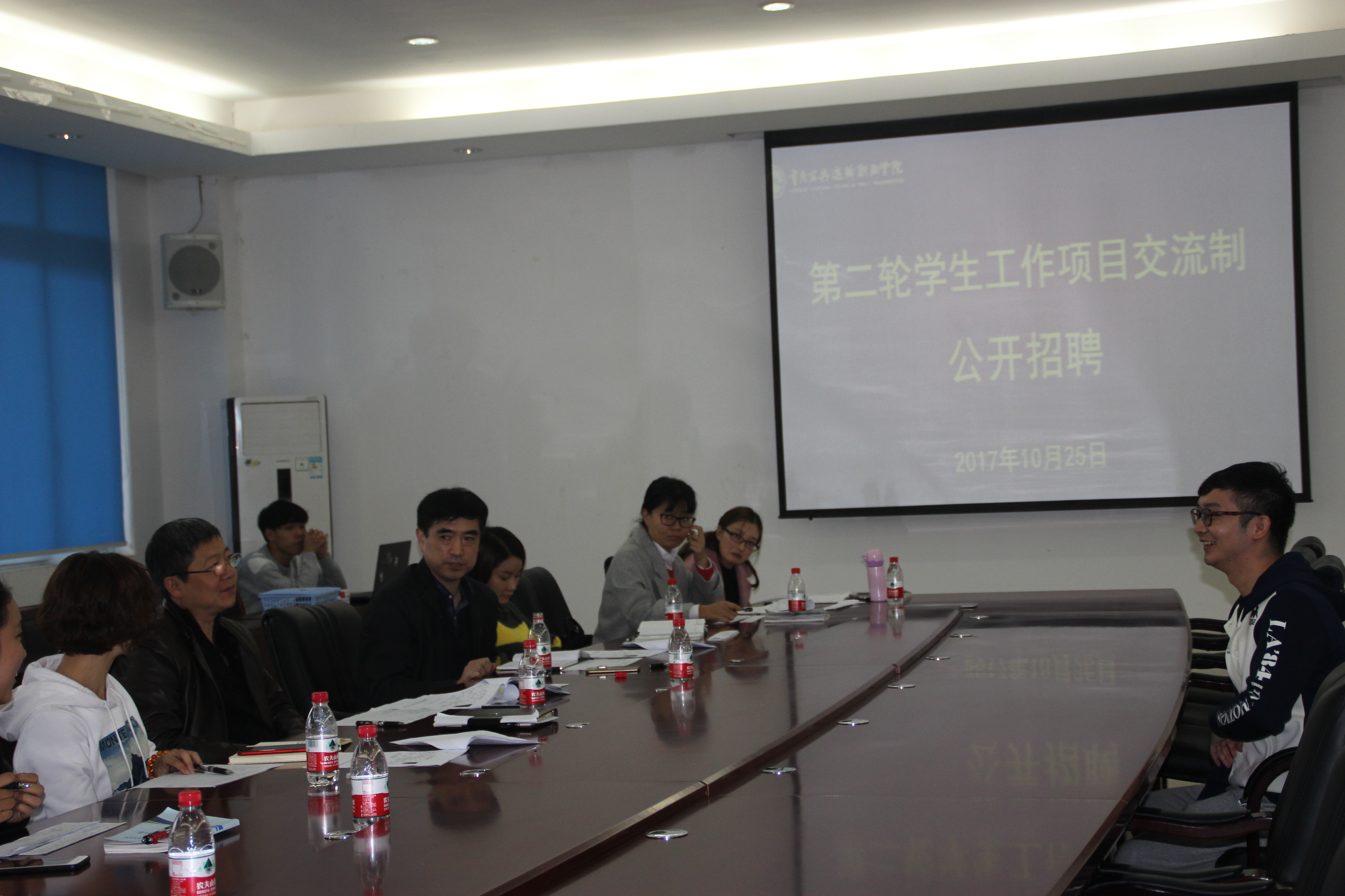 为进一步加强辅导员队伍建设,切实提高辅导员职业能力,努力打造一支“政治强、业务精、纪律严、作风正”的优秀辅导员队伍。第二轮学生工作项目交流制校内公开招聘会于2017年10月25日上午09:00在A402会议室顺利举行。本次交流的岗位有学生职业素质教育中心—教学科研部负责人、学生职业素质教育中心—实践技能部负责人、学生职业素质教育中心—文化活动部负责人、学生职业素质教育中心—创新创业部负责人、各系心理健康负责人、团总支书记、艺术团负责人、团委干事。8个岗位,共招聘12名交流人员。