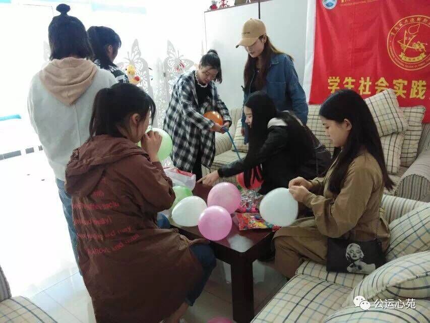在早上8:40,我们协会的工作人员就开始在浮雕广场布置活动现场了,拉横幅、搬桌椅、调整音响,熊倩老师也一直在现场指导协会工作人员摆放活动物品,为了使活动现场的气氛更加浓重,协会工作人员来到办公室吹气球,用气球来装饰活动现场。