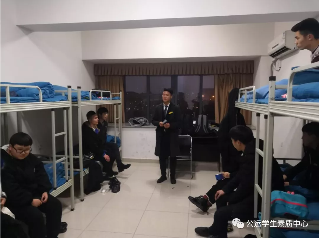 短暂路途的行驶,配着朦胧的灯光,他们安全抵达重庆北站南广场,组长主动配合带队老师进行整队,同学们积极配合,整齐有序的迈向综合大楼出乘会议室。但因车长临时接到任务,不能按时召开会议,同学们就回到休息室自行准备。